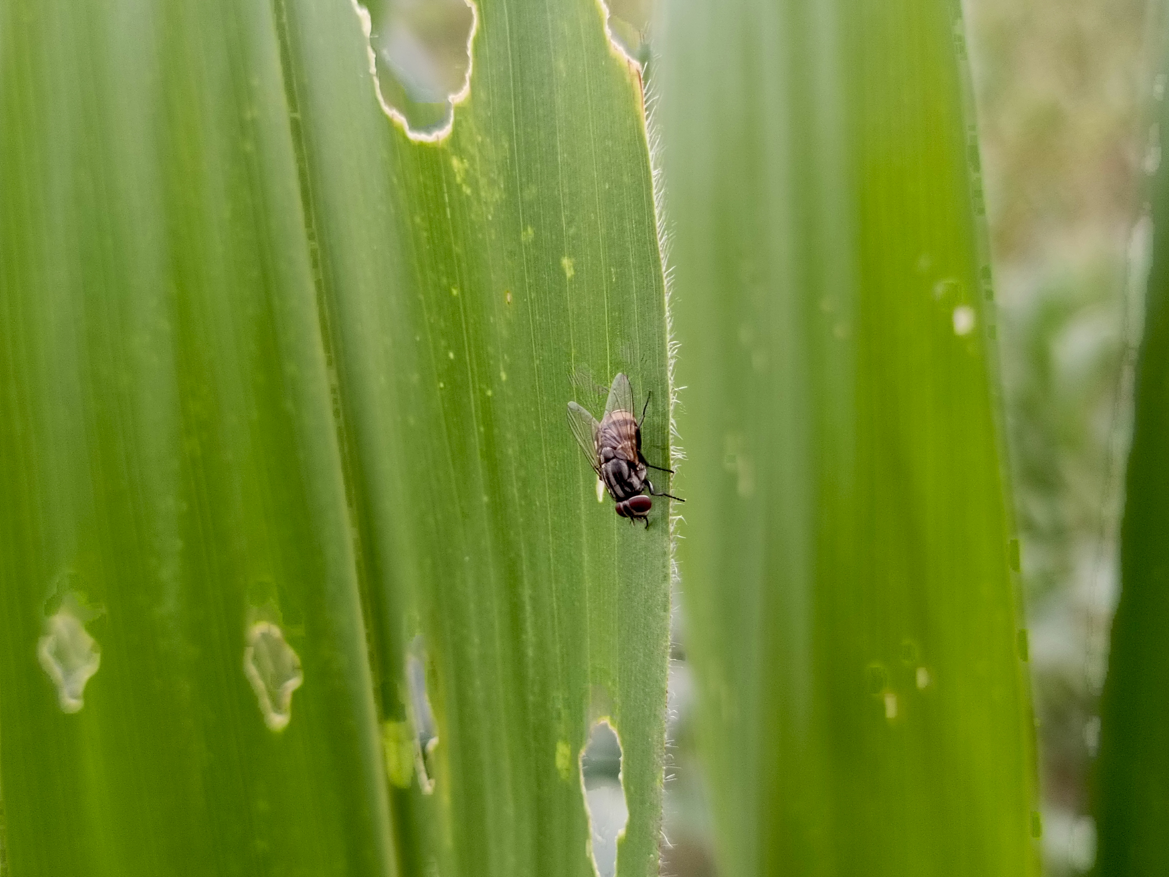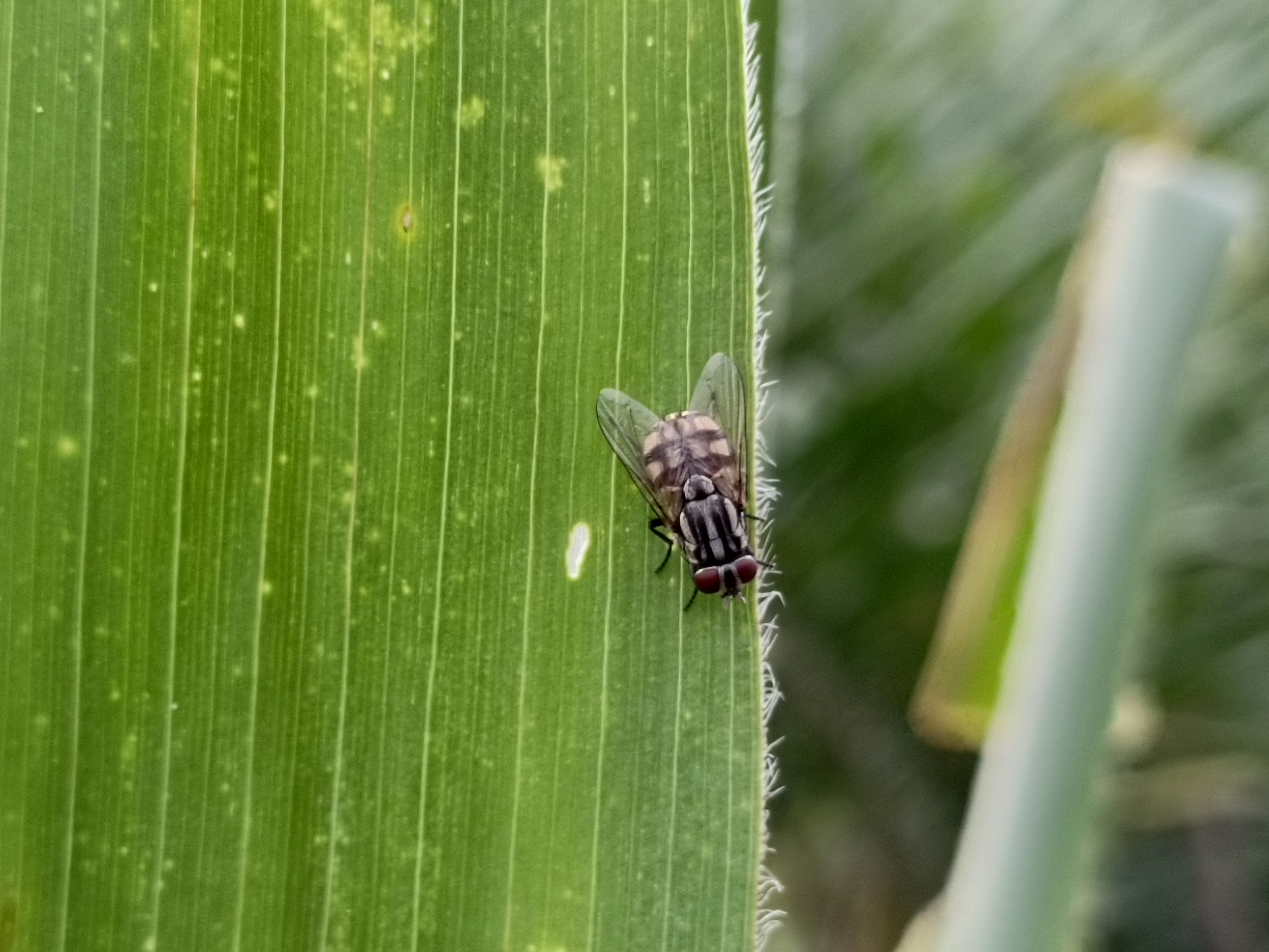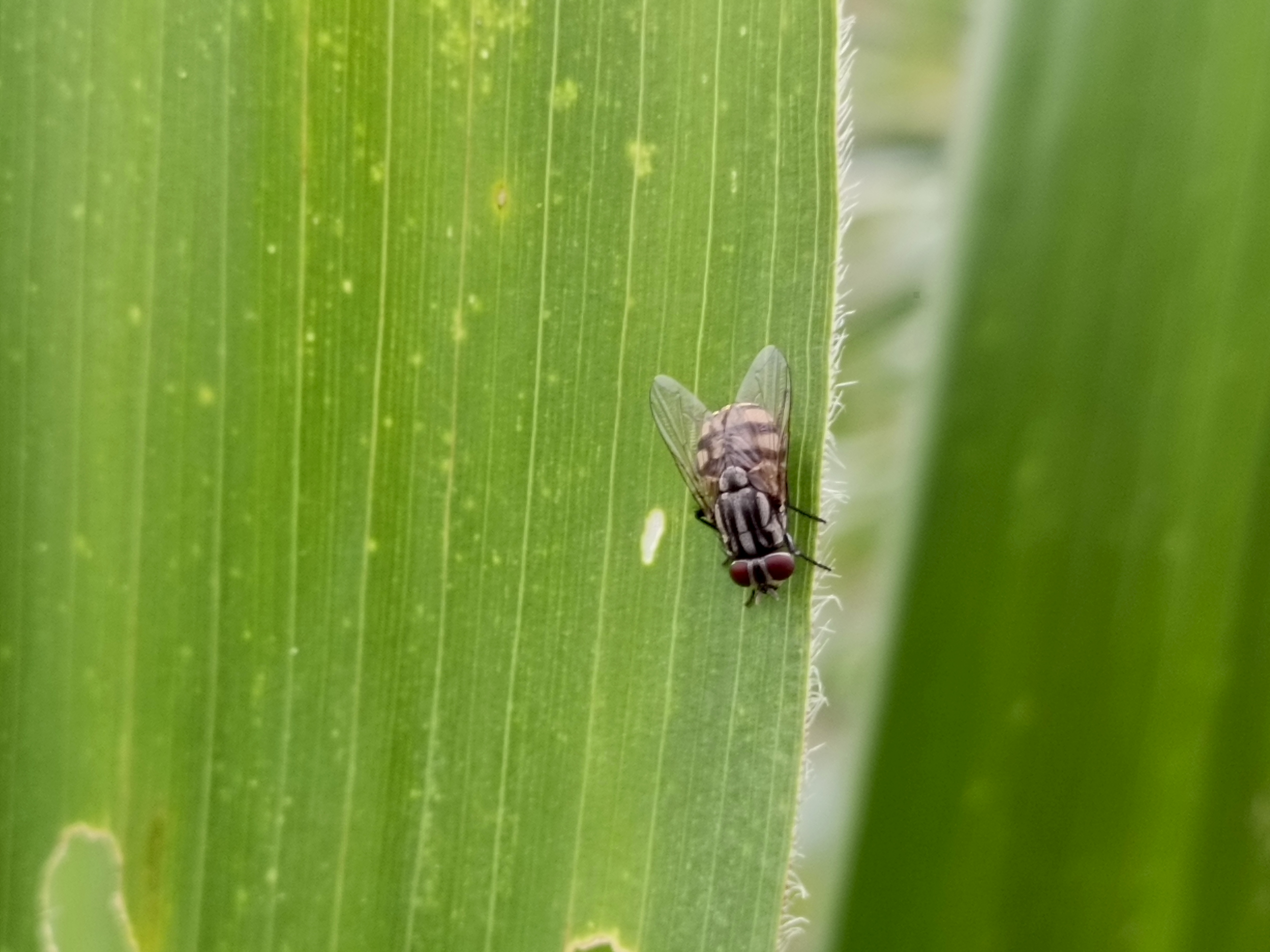 So, I took this picture of a fly in a corn field. I saw many insects flying on the leaves, and one of them was a fly. That's why I took this picture of a fly. This fly didn't fly away and landed in place, allowing me to capture some of the images we see now.