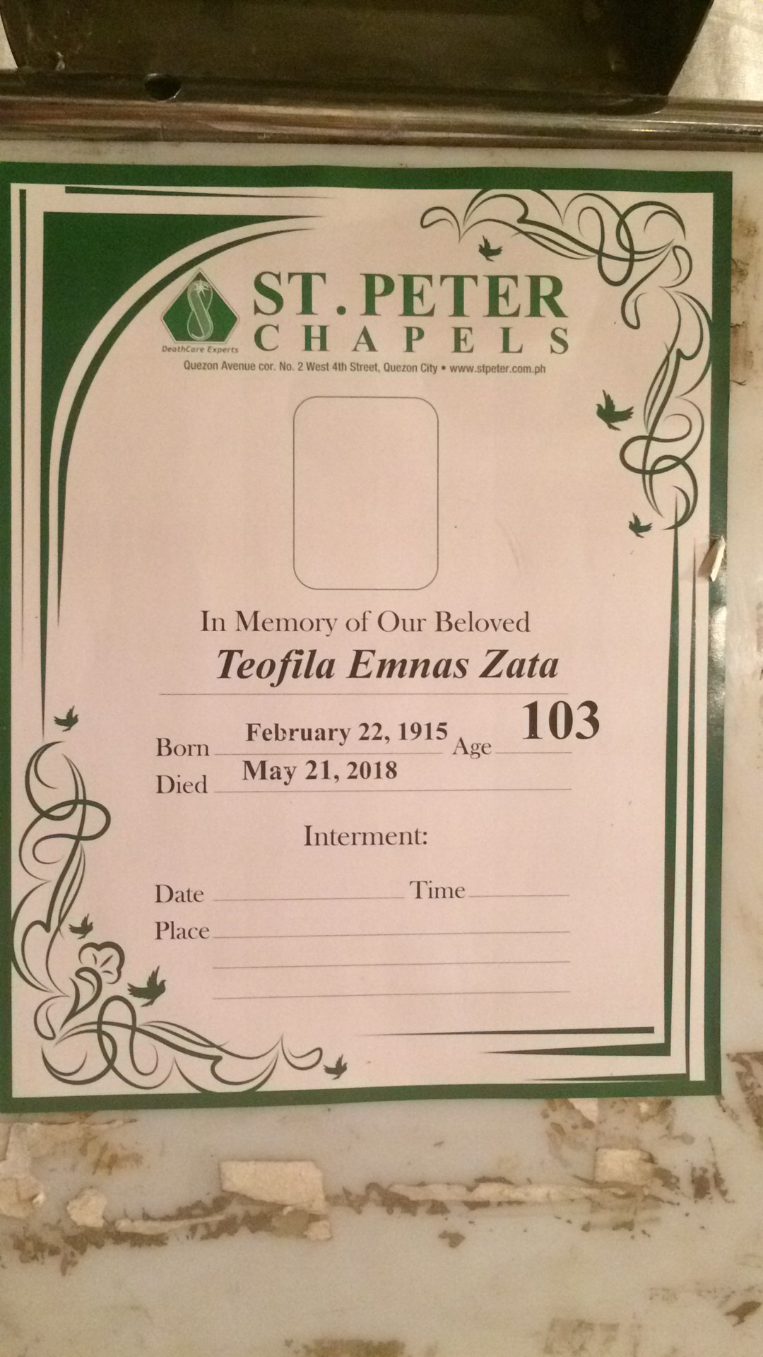 This is the late Mrs. Teofila Emnas Zata, a wife, a mother, and a good citizen.