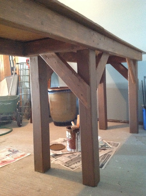 The shelves were ones my Mom stained for me years ago when I went off to school so it was nice that I could reuse them. If I need more shelves, I still have two others. (Before the days of IKEA and cheap bookshelves, we went off to college with boards and bricks.) I also had almost a full sheet of plywood which became the top of the bench and I used my deck stain on the bench. The next photo was taken on a hot day while I was painting under it.