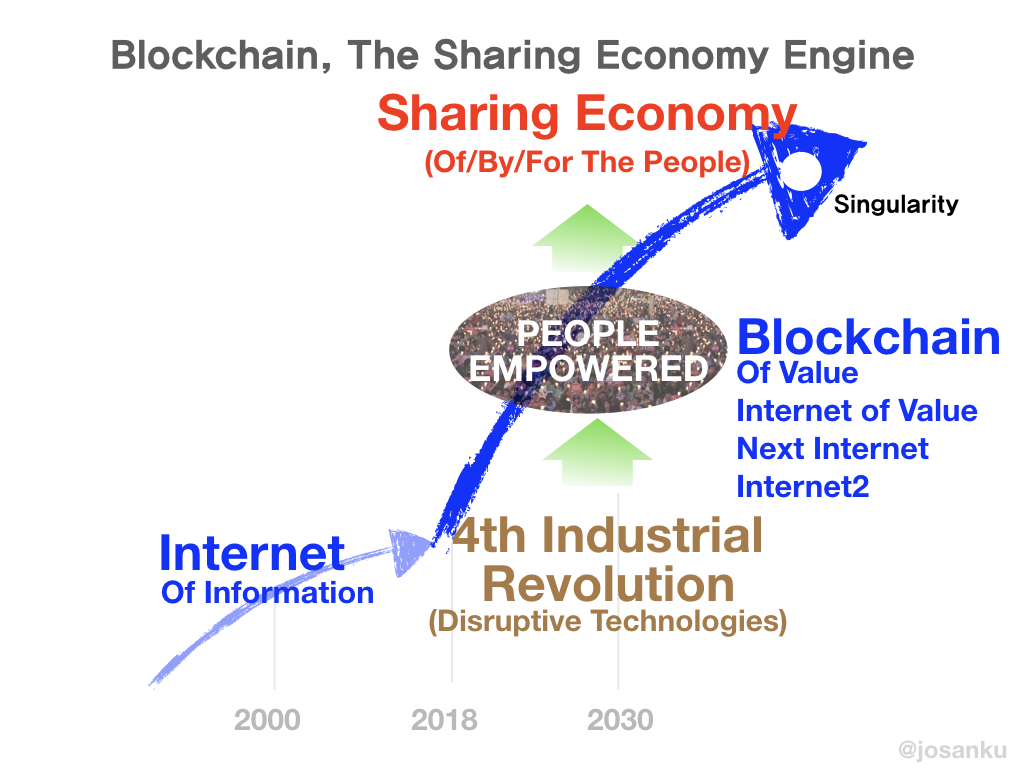 기존 인터넷과 블록체인의 관계와 영향력을 고려한 개념이다. 4차 산업혁명과 블록체인 및 공유경제는 유기적인 연관과계가 있다. 4차 산업혁명은 다양한 기술이 빠르게 발전하고 융합하는 현상으로 정의할 수 있다. 첨단 기술은 그 어느때보다 우리 사회에 엄청난 영향을 미치고 있지만 중요한 다른 사항은 이러한 기술의 발전은 개개인의 역량과 역할을 증대한다는 거이다. 인터넷이 'Power shift to the people' 현상을 가속해 온 것 처럼 블록체인 또한 정보의 영영을 넘어 모든 가치의 영역에서 개개인의 역할과 힘을 증대할 것이다.