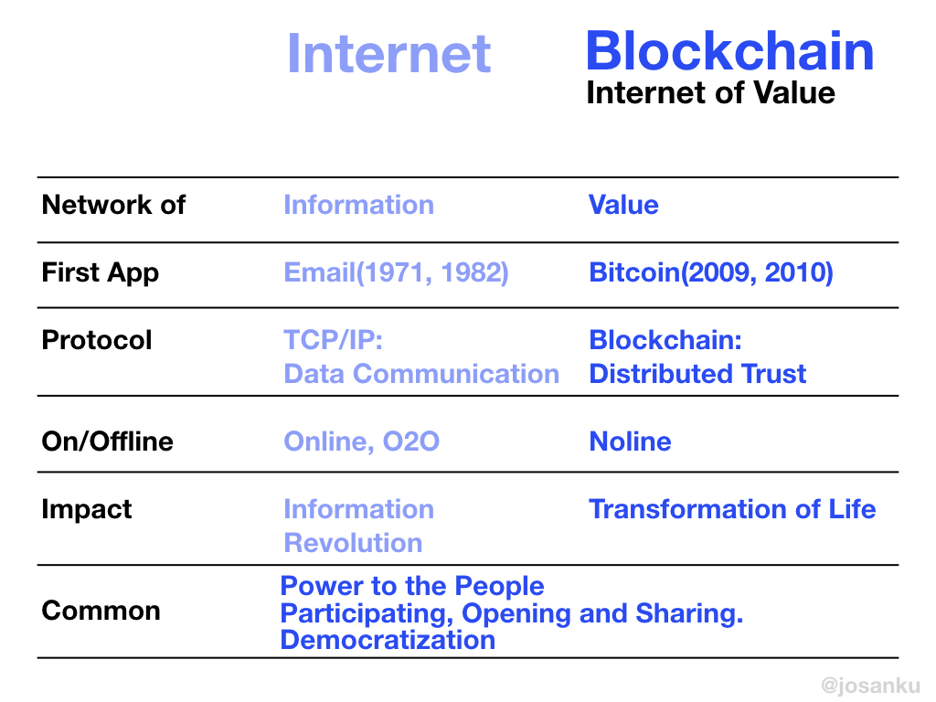 인터넷과 블록체인을 분야 별로 비교해 본 것이다.