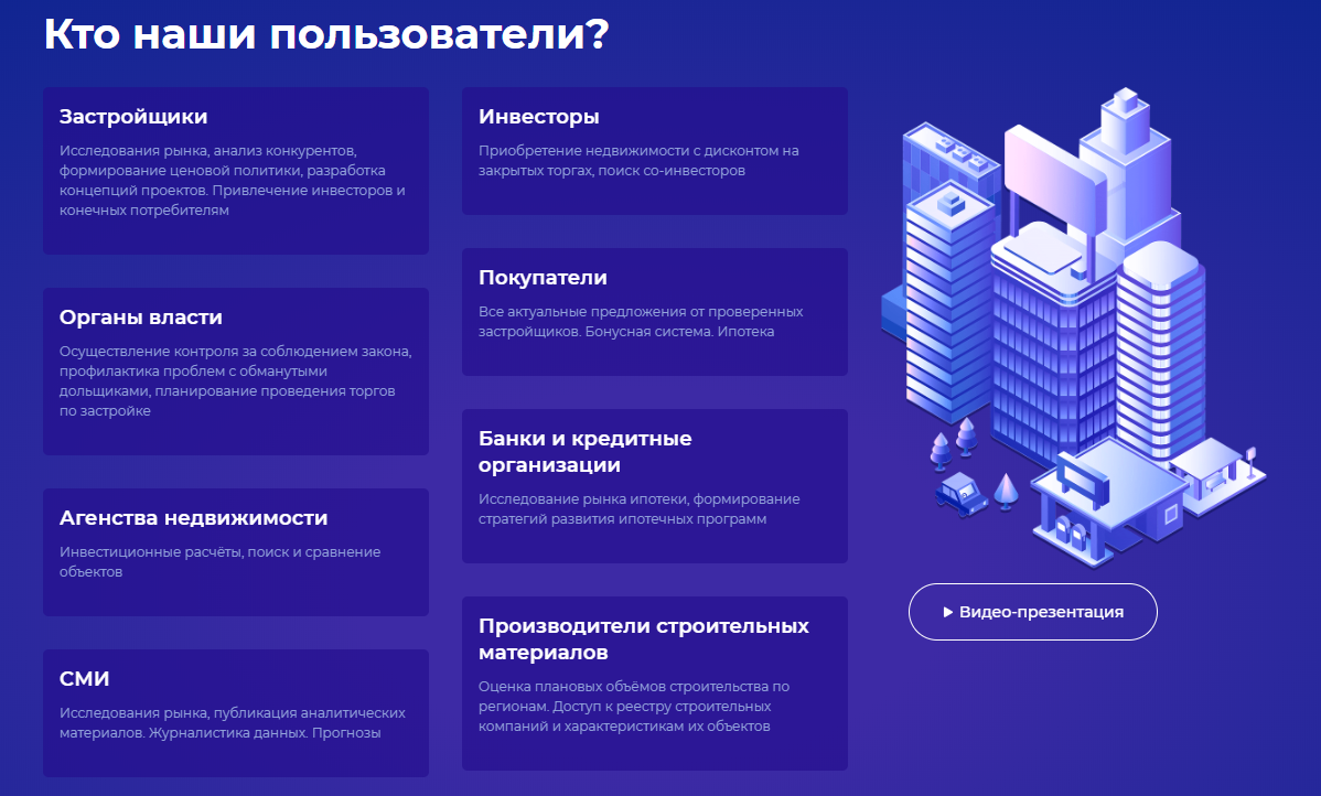 Интро - это BI-система или "бизнес-аналитика" для участников внепланового развития — строителей, инвесторов, покупателей жилья, банков и других агентов.