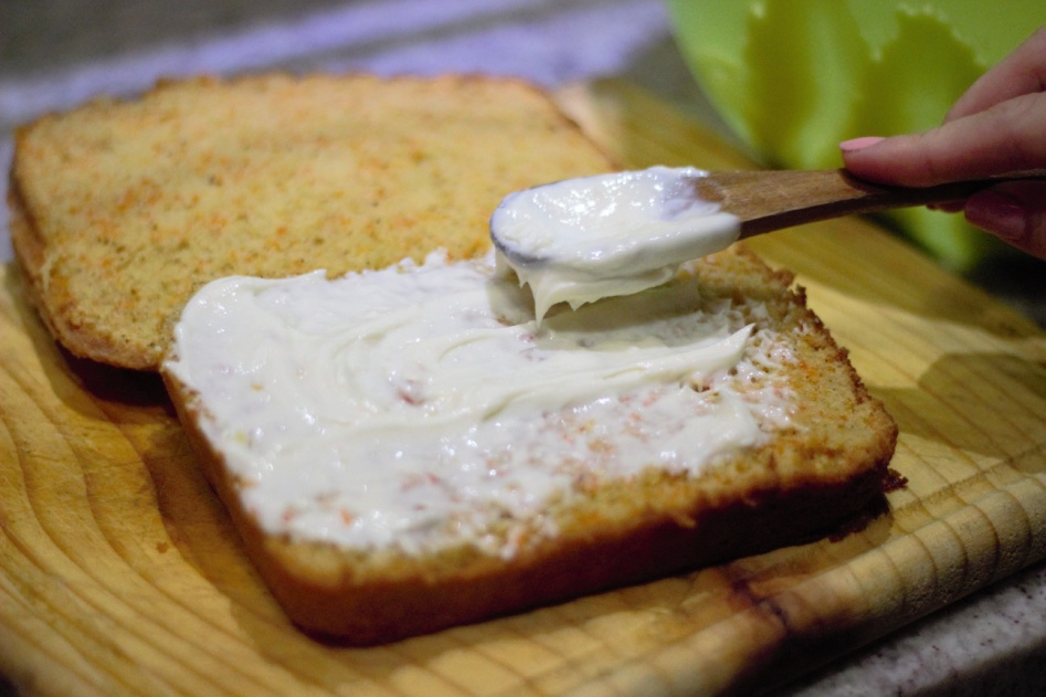Una vez sacada la torta del horno, esperamos a que se enfríe y la dividimos en dos partes así como se ve en la foto y rellenamos con frosting. Luego decoramos la parte superior, es opcional usar frutos secos para decorar como nueces. (Es opcional) Y listo, tenemos nuestra deliciosa torta de zanahorias para degustar con nuestra familia y amigos.