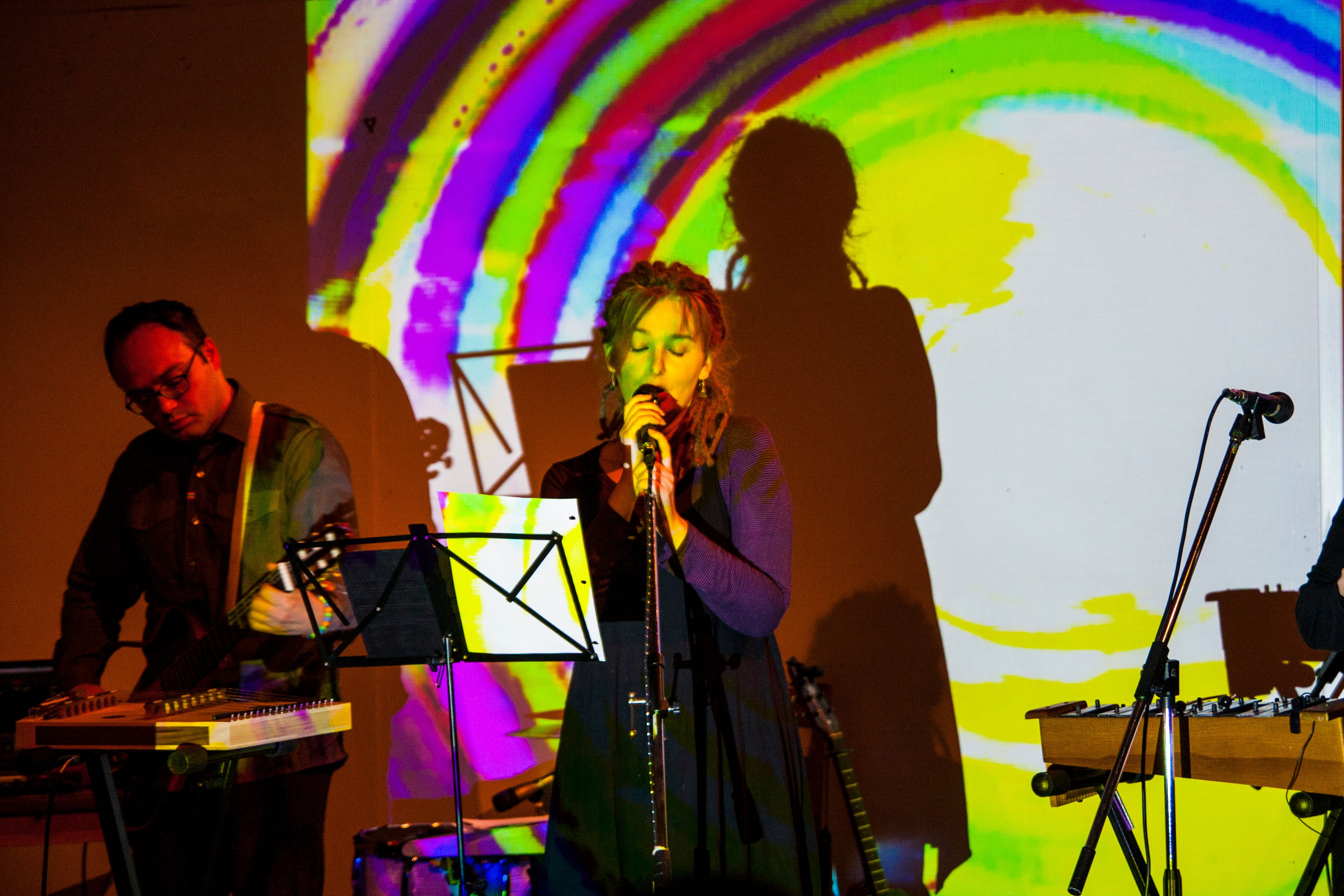 Robyn (the one with the dreadlocks) sings, plays with loops and composes using the piano and double bass.