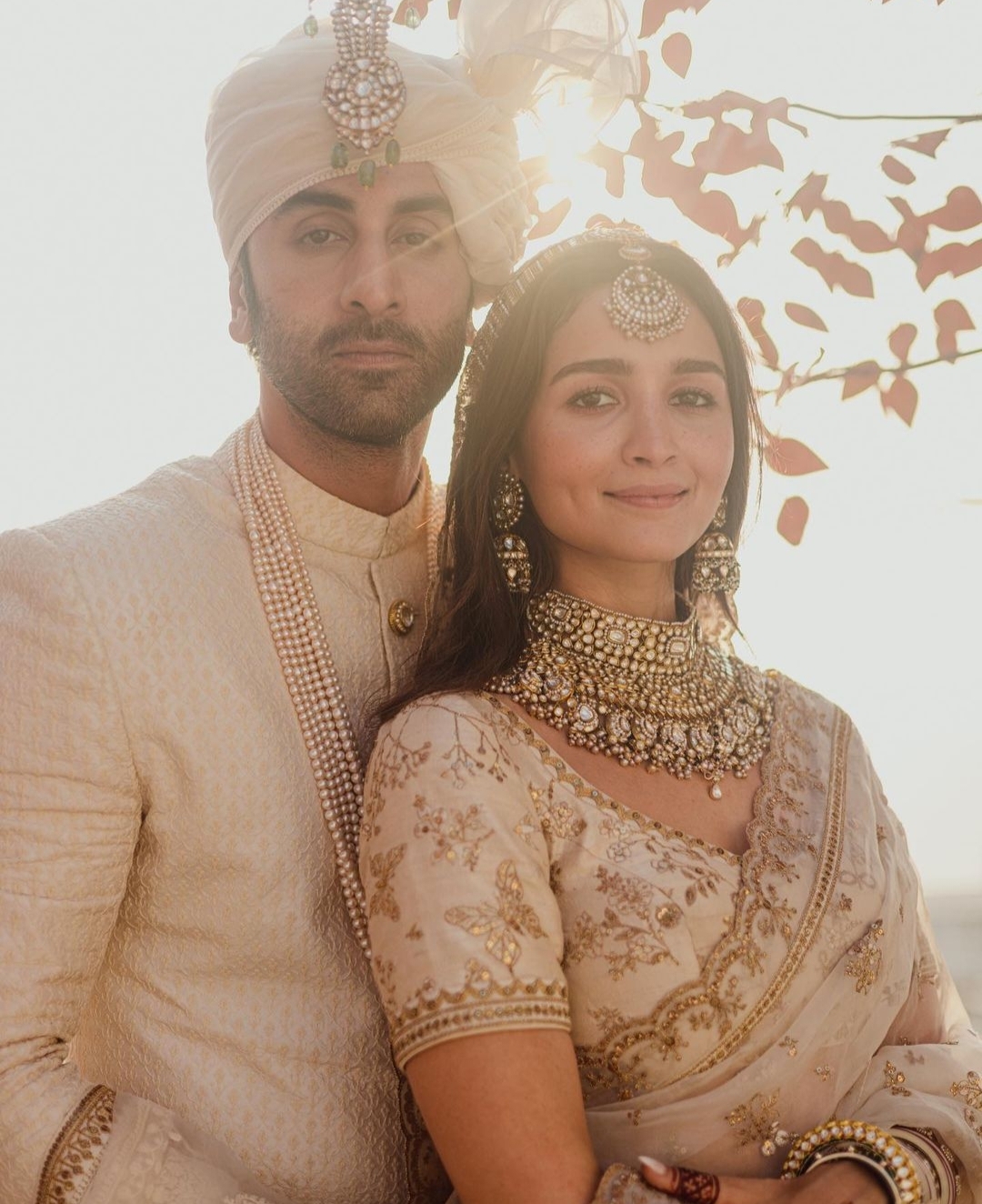 রণবীর-আলিয়ার বিয়ের ছবি দেখার জন্য মুখিয়ে ছিলেন তাঁর অনুরাগীরা। প্রথমে ইনস্টাগ্রামে আলিয়া বিয়ের ছবি শেয়ার করে নিজেদের স্বপ্নের কথা জানালেন। তারপর কথা মতো সন্ধে সাড়ে ৭ টা নাগাদ এলেন সাংবাদিকদের সামনে। মণীশ মালহোত্রার ডিজাইন করা পোশাকেই সেজে উঠেছিলেন রণবীর ও আলিয়া।