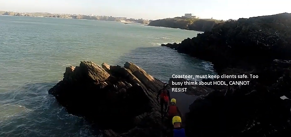 Coasteering, if you haven't heard of it, consists of touring along the coastline wearing bouyancy aids and helmets. I guide people on these trips using a bit of swimming, jumping climbing and caving to get around. On the way you get to see local wildlife like seals, crabs and fish and our highest jumps are about 10 metres!