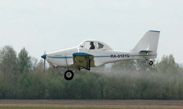 Particularized agricultural airplane “Farmer” “Farmer” performance Maximum speed…………………………..200 km/hOperating speed ………………………25-160 km/hSpan………………………………………….10.4 mAirplane length…………………………....... 7.15 mAirplane height………………………………. 2.2 mWing square……………………………… 13 sq.kmEmpty airplane weight …………………….. 606 kgMaximum take-of weight…………………. 1100 kgChemicals weight …………………………...295 kgAccelerative forces…………………………... +4/-2Engine………………………….. Lycoming IO-360Engine power……………………………… 180 h.p.Fuel consumption: - during the agrochemical works….. 40 liters/hour - during the flight …………………..32 liters/hour Fuel weight……………………………….. 82 litersCultivation area for 1 flight ……….30-95 hectaresCapability…………………….90-320 hectares/hour The particularized agricultural one-seater airplane “Farmer” has an efficient and simple construction, made for repetition work.The aircraft took it first flight in 2002. Its design is based on extensive analysis of market needs and demands, in a close contact with farm enterprises and agricultural aircraft operators. Main concepts for Farmer are high safety and low-cost operation. “Farmer” doesn’t demand a special runway, a rolled grounding will be enough. The airframe is all-composite, so the problem of corrosion resistance while working with aggressive chemical materials is essentially simplified. Wing airfoil and shape provide good anti-stalling characteristics on high angles of attack. Wing devices include hinged flaps and slot flaps. Fuselage layout is typical for agricultural aircrafts with an engine in the nose, chemical hopper right behind it just at the aircraft’s center of mass and cockpit following all that. This scheme is developed to provide maximum pilot protection in case of aircraft crash. Besides this, “Farmer” is equipped with parachute recovery system. This makes a great contribution to safety flight, as in several cases recovery system proved to be effective even at low altitudes of 5-10 m. Heavy-duty main undercarriage is pyramid with air-hydraulic shock absorbers. Main wheels of 600 mm in diameter and separately driven hydraulic brakes provide high cross-country abilities.Able to fully castor, the tail wheel is mounted on titanium shock absorber. Thoroughly worked through airframe and control surfaces aerodynamics provides great aircraft stability and controllability, which is of a great importance at low-altitude flights. “Farmer” was run through operation testing in 2005-2006. In June 2006 the aircraft showed the greatest productivity of 1800 ha. per a day with application rate of 7 liters/ha. and 2800 ha. with application rate of 3 liters/ha. Every issued airplane has a Russian certificate - Single Aircraft Instance, which corresponds to American certificate – Experimental.