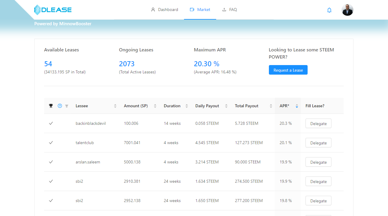 Confidence in the service's viability can be based on the fact that DLease's predecessor MinnowBooster.net has already filled nearly 20 Million in STEEM POWER (SP) leases since inception, with nearly 2,000 leases active at any given time.