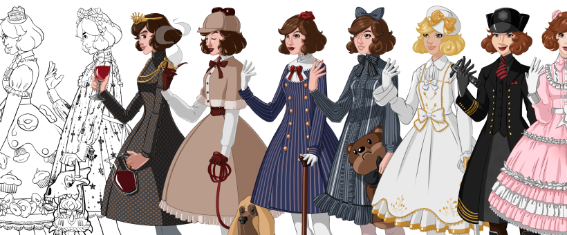 Collage of illustrations I did for my Lolita Fashion Coloring Book:
