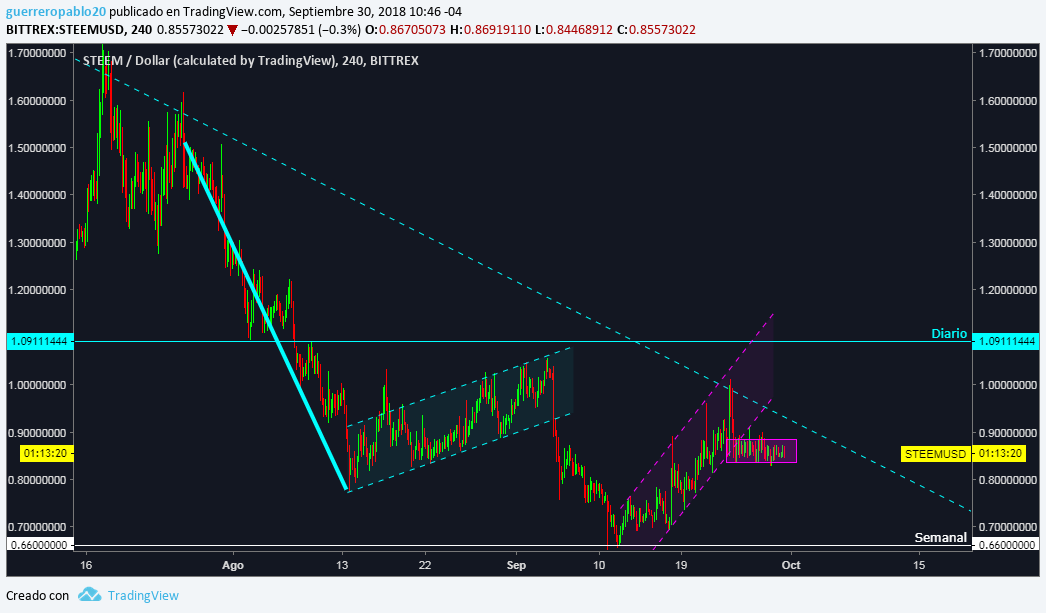 Se puede observar un canal alcista (MORADO) que se viene dando desde el 18 de septiembre de 2018. Aproximadamente el 24 de septiembre, el STEEM alcanzó un valor máximo en dicho canal de 1$ por STEEM, para luego caer y romper el canal alcista. Actualmente el precio esta oscilando en un rectangulo de color morado, lo que significa que el mercado esta preparandose para un movimiento fuerte. Mi predicción basada en algunos otros indicadores que ire mostrando mas adelante, es que el STEEM caiga hasta la linea blanca (SOPORTE SEMANAL) en los próximos dias.