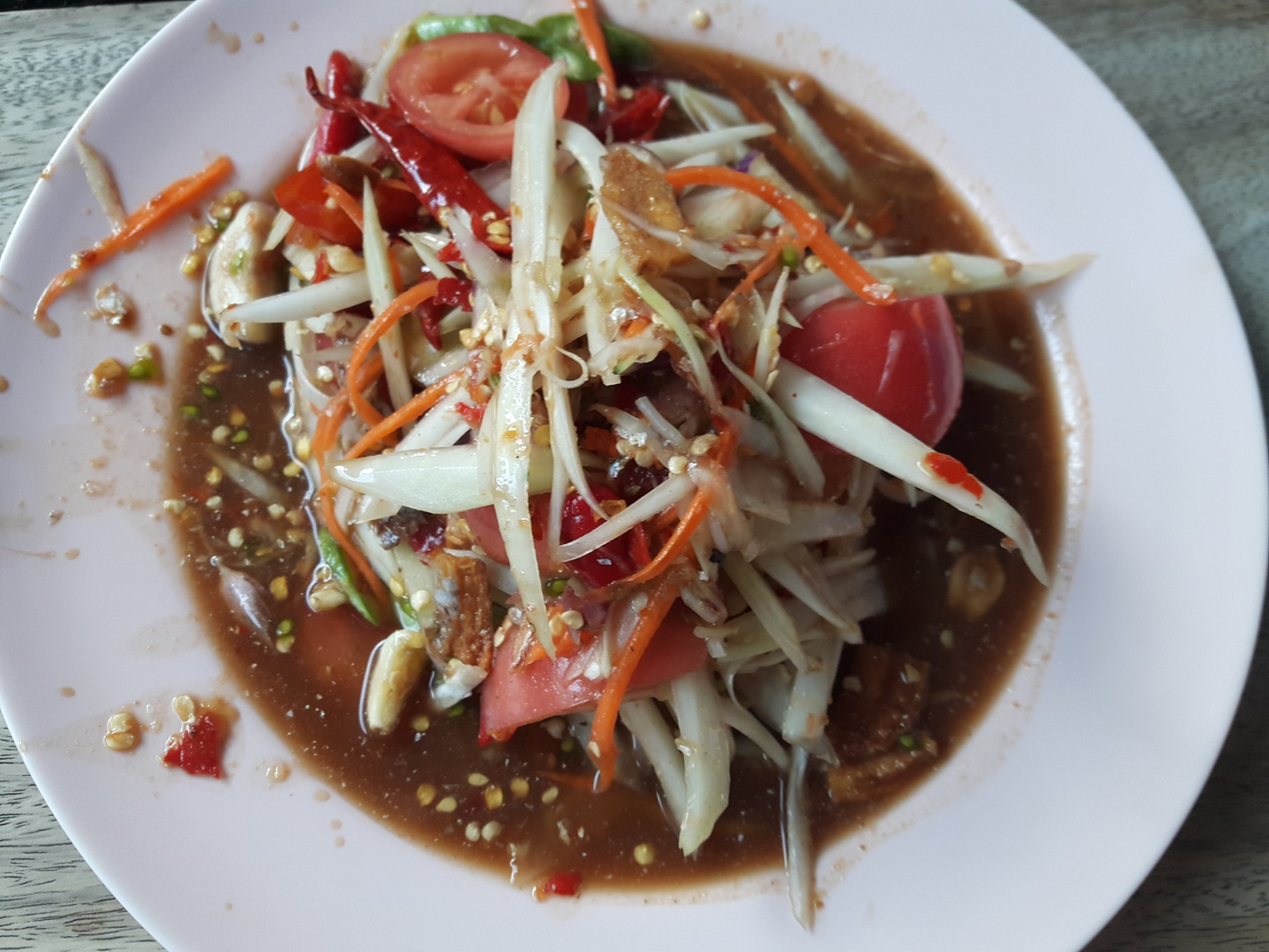 Som Tum or papaya salad. With the spiciness, It is favourite and hot dish for many people.