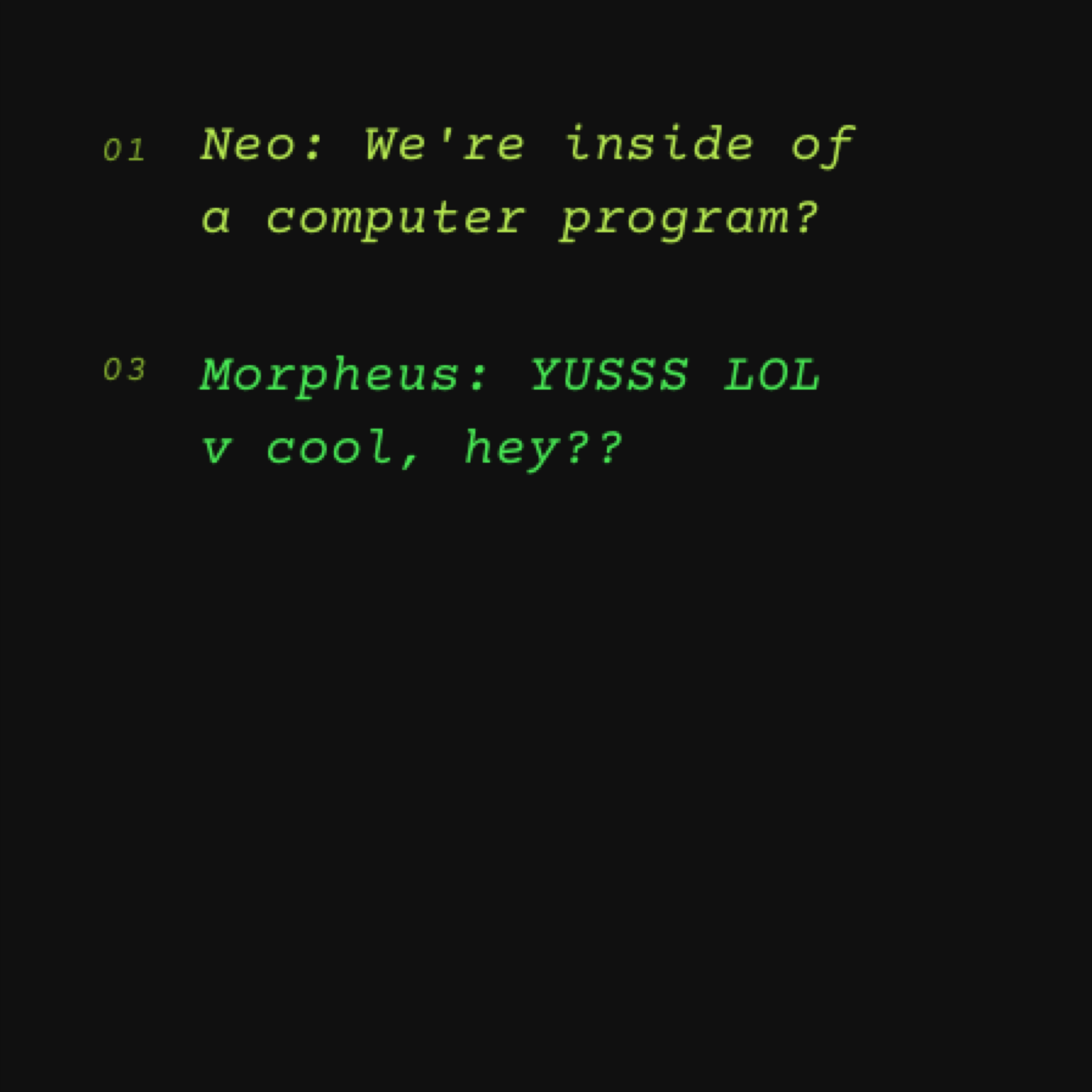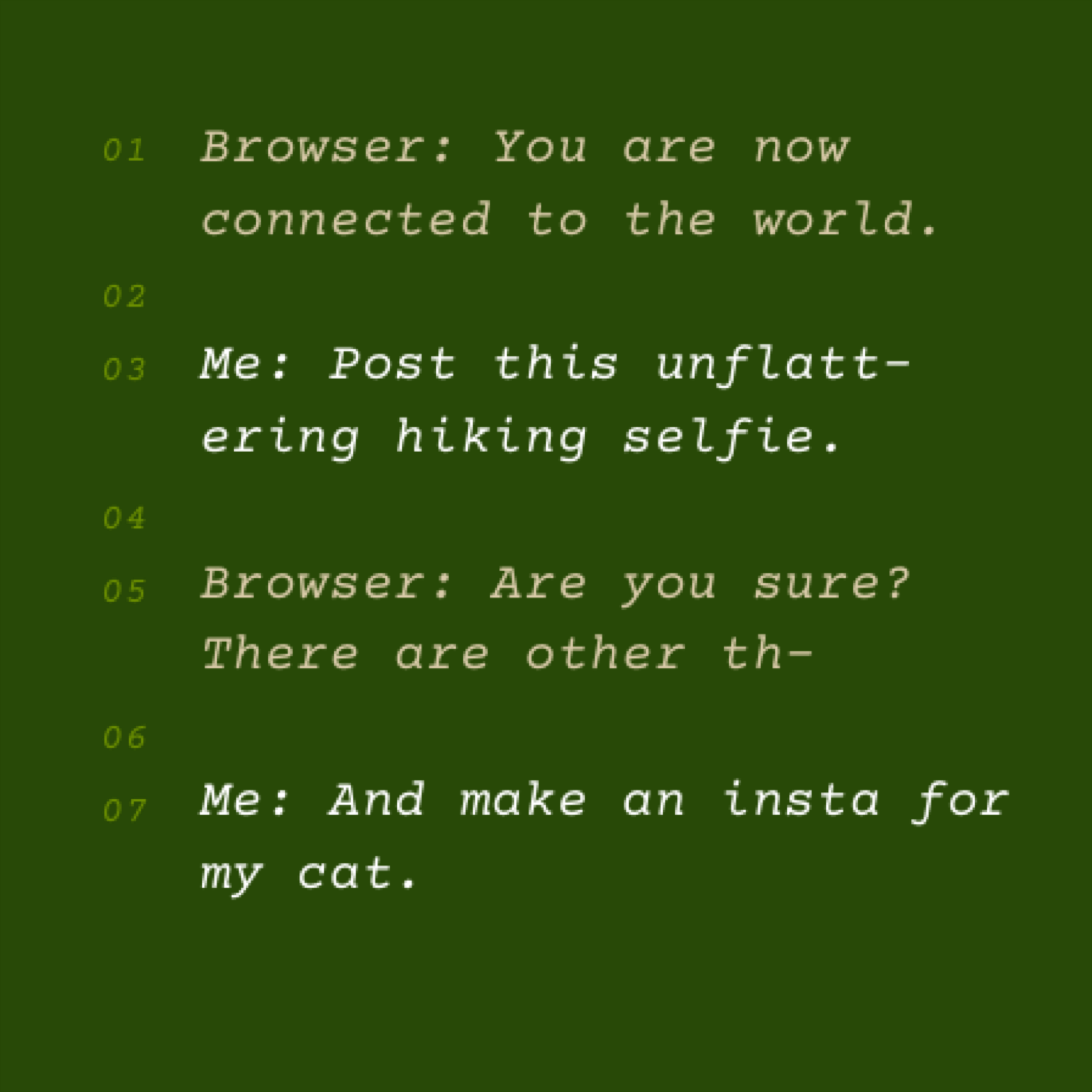 In the meantime I've got a great community on instagram, where we collaborate on hex colors, glitch pictures, and post writings that are either code or poetry but no one can tell. Let's hang out there! @lucaswglenn.