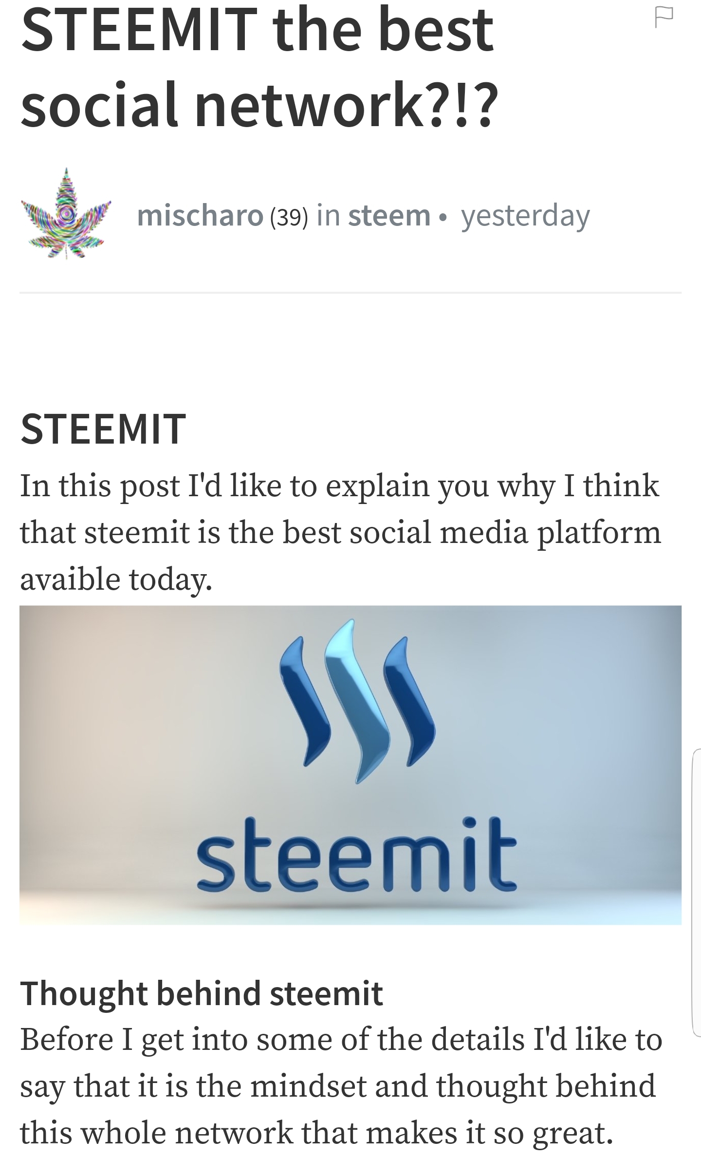 Welcome to Steemit @mischaro :)