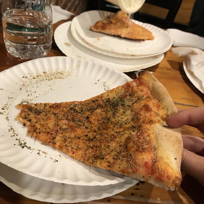I like mine with oregano and a good amount of garlic powder. Everyones different you can see my best friend pouring on the cheese in the background. PS my friend went to pour the garlic powder at this place and It's lid came off and it there was garlic EVERYWHERE. (I should've took a picture, I mean everywhere.
