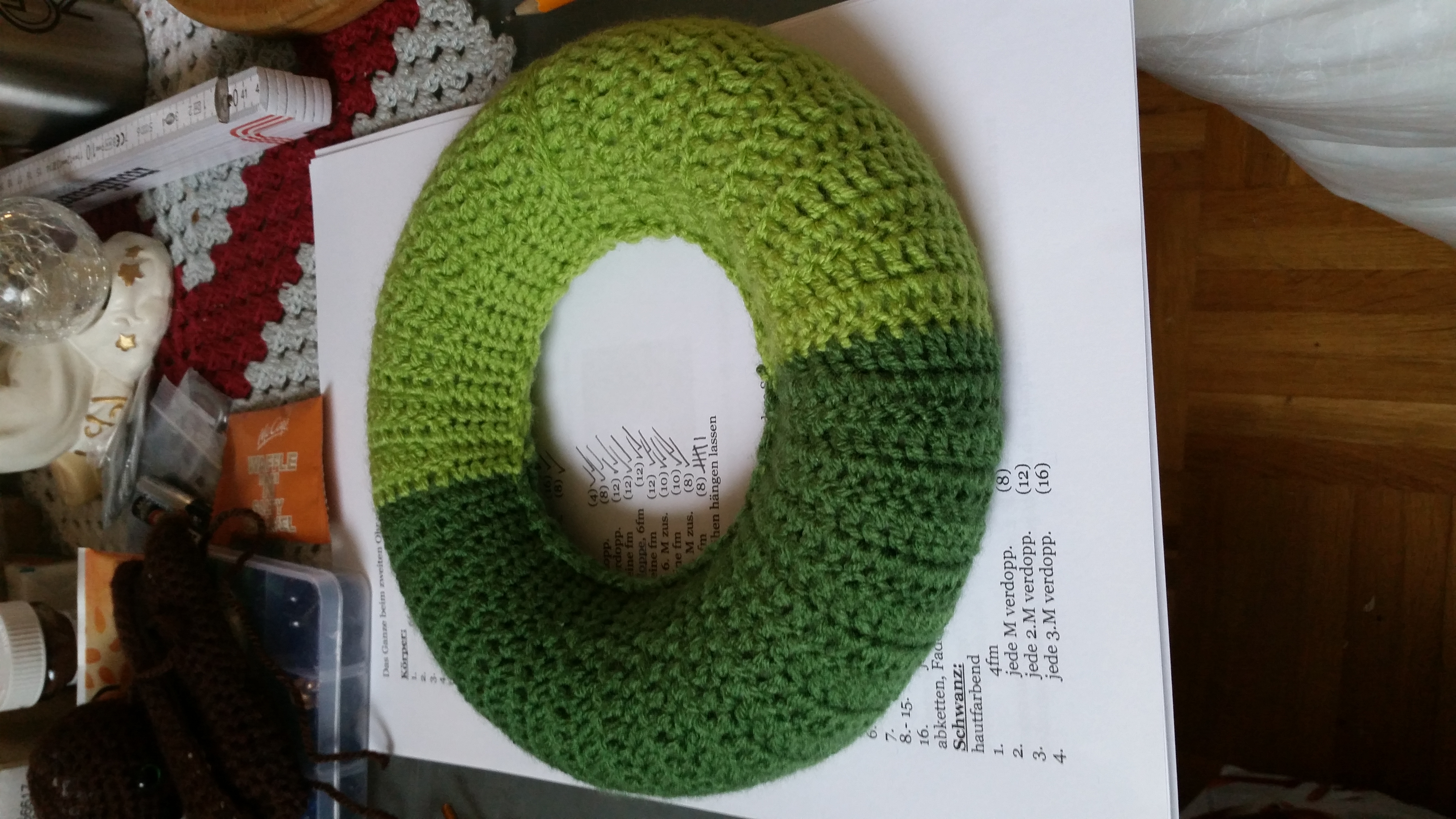 Die Basis ist ein Styropor Ring und das Muster ist ein dreifach Stäbchenmuster. Ich habe 2 unterschridliche Grüne Garne verwendet um mehr tiefe zu bekommen und es hat mir einfach besser gefallen als einfarbig.