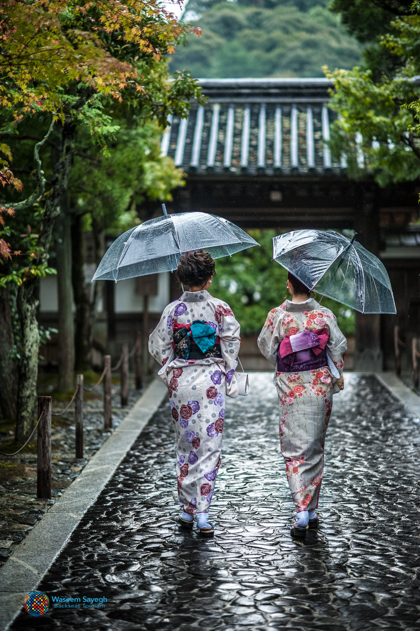 Two Japanese women in traditional clothing holding transparent umbrellas walk towards the main gate of Higashiyama Jisho-ji Temple. Photo taken in Kyoto, Japan.