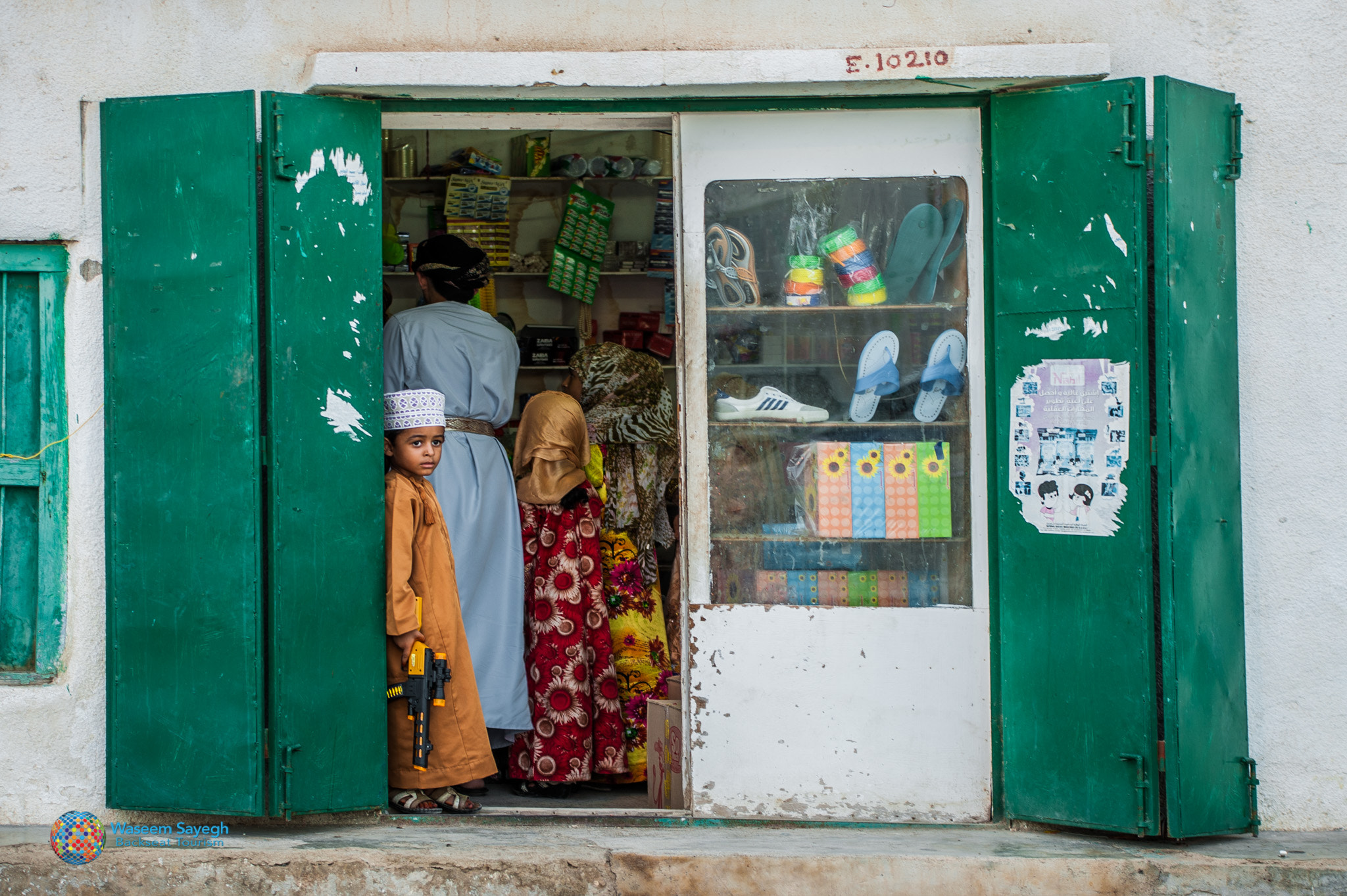 A boy stands at the entrance of a old corner store with is toy gun. Photo taken in the outskirts of Muscat, Oman