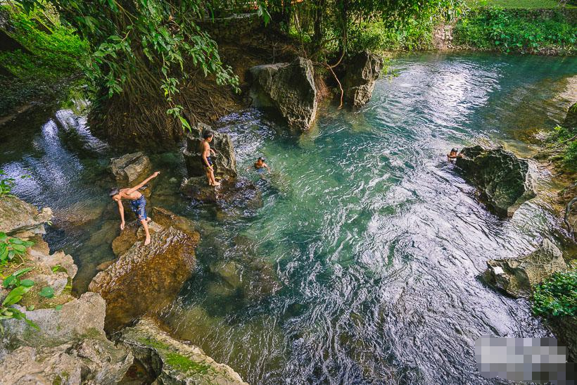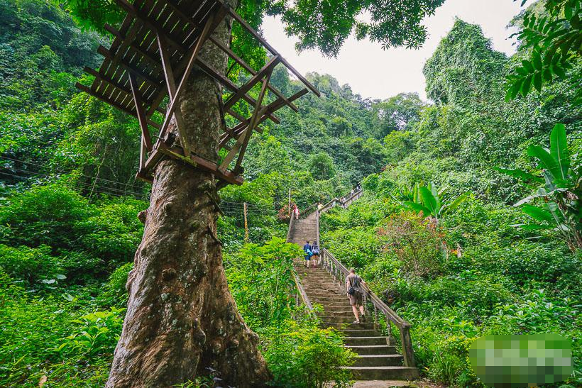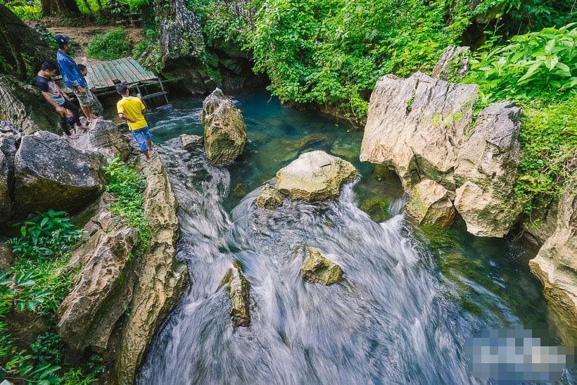 ຈາກຈຸດຂົວຍ່າງເຂົ້າໄປທາງຊ້າຍມືປະມານ 200 ແມັດ ກໍ່ຈະຮອດຖ້ຳຈັງແລ້ວ ເຊີ່ງທາງໝ້າຖ້ຳມີສາຍນ້ຳໃສໆໃຫ້ເດັກນ້ອຍໂດດອາບນ້ຳຫລີ້ນ ແລະ ຖ້າແມ່ນໃຜຢາກຂື້ນໄປທີ່ເທີງຖ້ຳແມ່ນຕ້ອງໄດ້ເສຍເງີນຄ່າເຂົ້າຊົມສຳລັບນັກທ່ອງທ່ຽວແມ່ນ 15000 ກີບ ເຊີ່ງທາງຍ່າງຂື້ນປາກຖ້ຳແມ່ນຕ້ອງຍ່າງຂື້ນຂັ້ນໄດ 147 ຂັ້ນ.