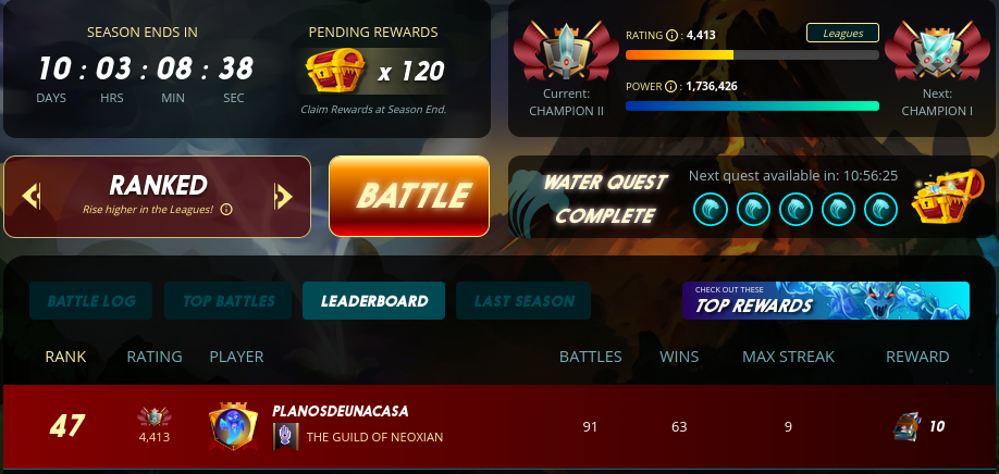 Actualmente estoy en Champion II, en el Rank 47, con Rating 4413. Y bueno, faltan 10 días para que acabe la temporada así que a seguir luchando.