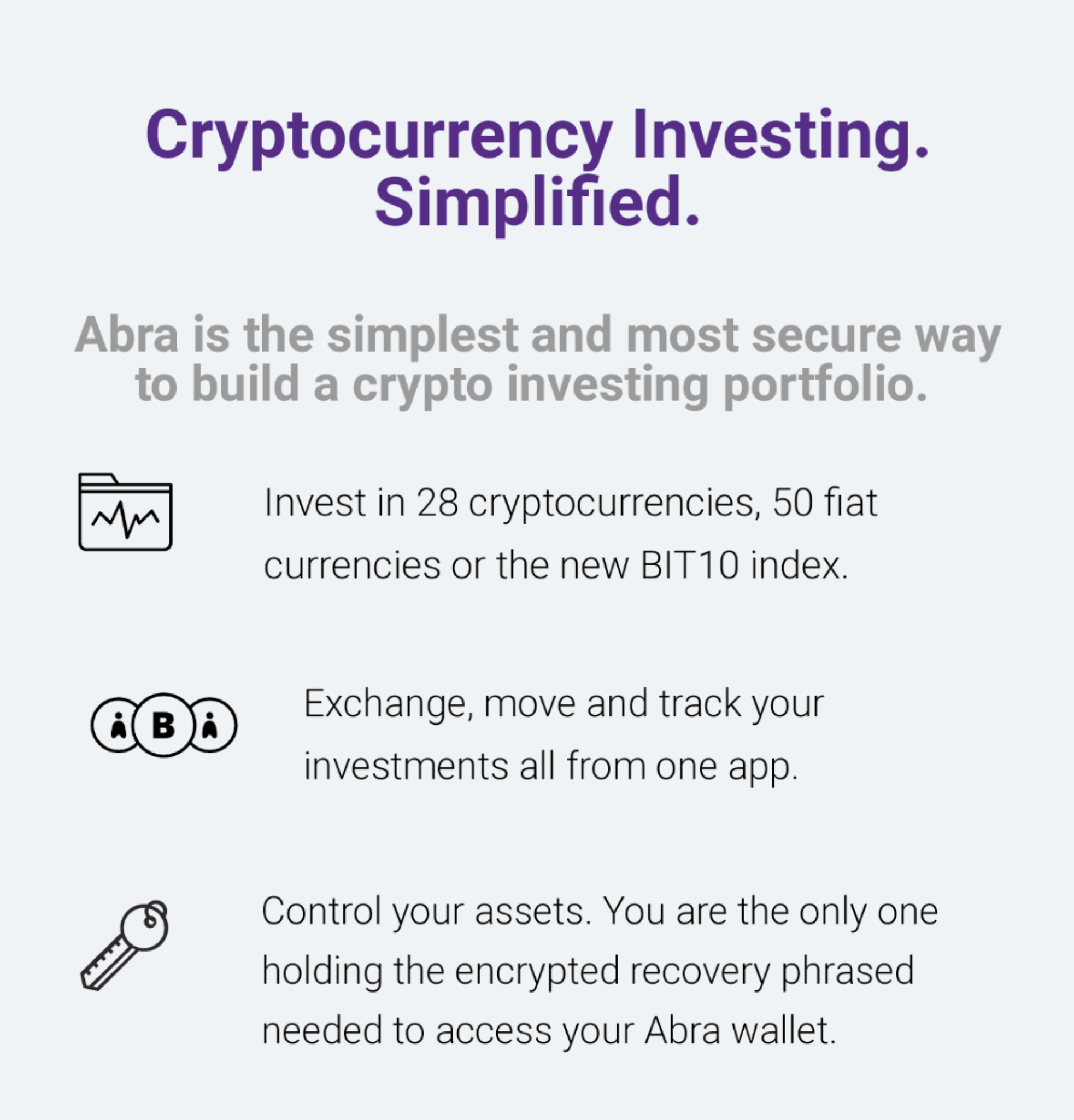 Abra is a great app to get started with investing in cryptocurrency, especially if your new to the game. I think Abra's Bit10 index fund is very cool and adds value to their service as it opens doors for anybody who wants to invest in it and forget about it. It's much easier than investing in individual assets and limits the risk. It's the same thing as Investing in mutal funds. It provides a safer but less potential profits.