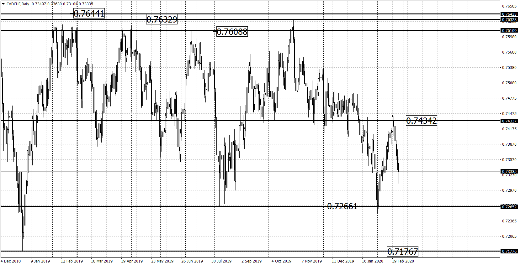 От недельной поддержки 0.7266 котировки по данному активу начинают рост и мы ждали оконание бычьей долгосрочной тенденции у недельного сопротивления 0.7434. Цена четко реагирует на данный уровень отскоком и формированием разворотных сетапов. После чего медвежья тенденция продолжается. Ждем цель по данному направлению к недельной поддержке 0.7266.
