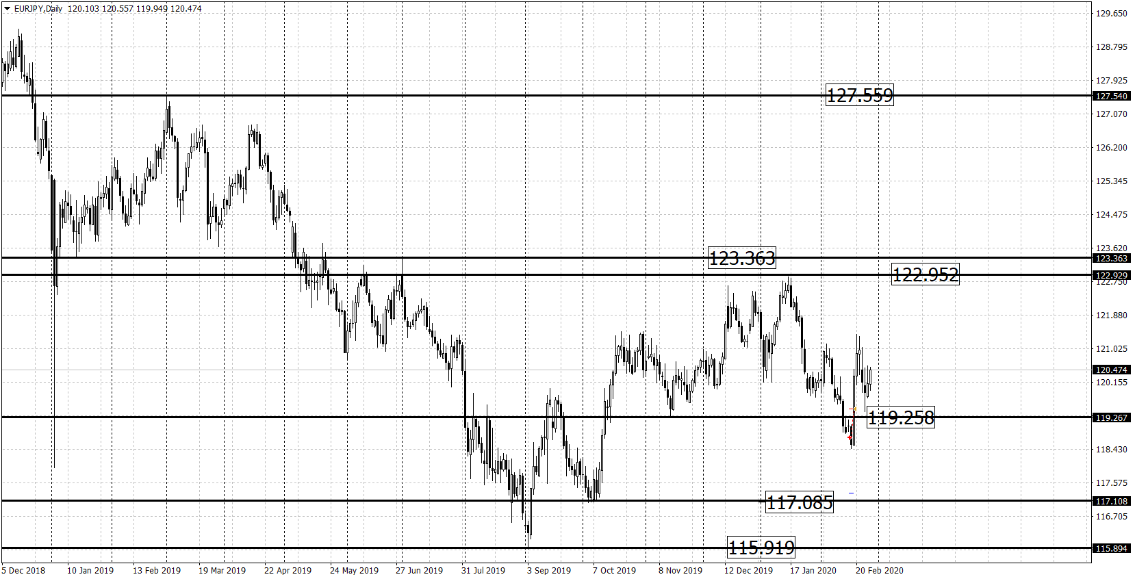 От уровня 122.95 по данному активу продолжается медвежья тенденция. В этом месяце котировки пробивают недельную поддержку 119.25 и тестируют ее снизу. Мы актив продавали в долгосрок с целевым ориентиром к недельной поддержке 117.08. Сделка закрывается по стоп лоссу. Уровень 122.95 можно убирать с графика, так как цена на него уже практически не реагирует. При условии продолжения бычьей тенденции нас интересуют шорты от недельного сопротивления 122.95. При условии медвежьей тенденции, покупать актив будем от недельной поддержки 117.08.
