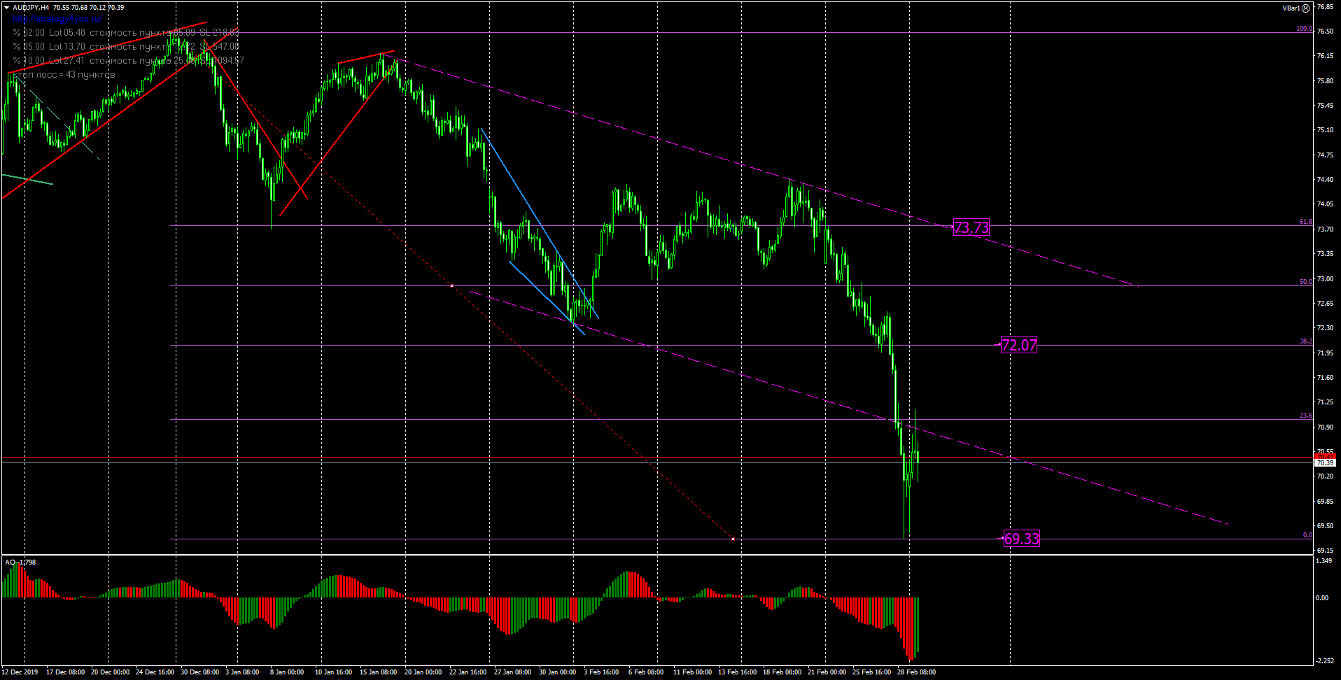 Валютная пара австралийский доллар японская иена на прошлой неделе продолжила снижаться и рынок закрывается пробитием линии поддержки нисходящего канала, сформировав новый минимум 69.33. Сегодня цена начала корректироваться и отскакивает от линии сопротивления нижней нисходящего канала. После формирования медвежьей свечи от данной линии, ждем продолжение нисходящего движения к переписи минимума 69.33. Если день закрывается в пределах канала, это сигнал к продолжению коррекционного движения к 38% фибоначчи от нисходящего движения.