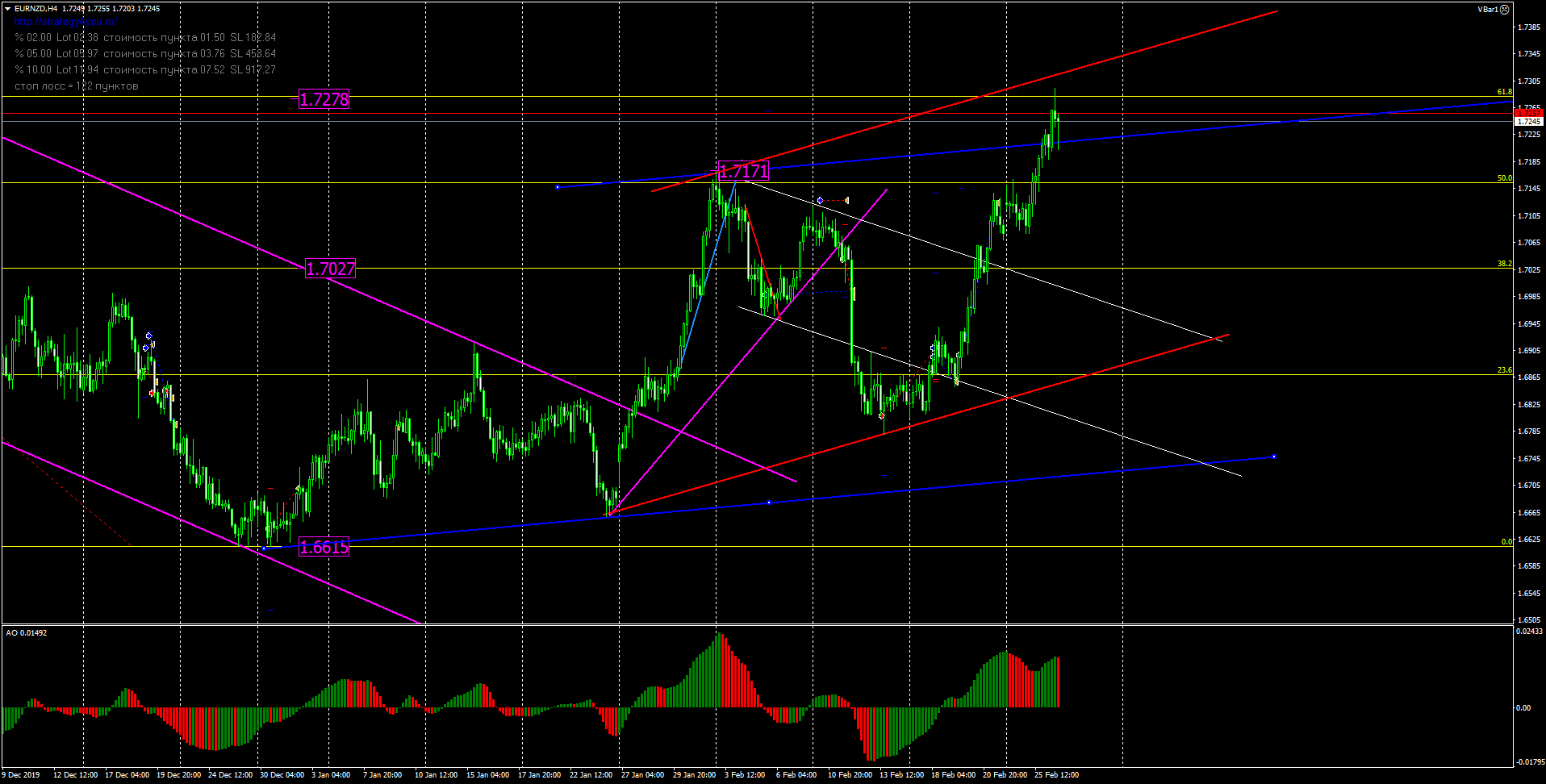 На прошлой неделе мы купили валютную пару евро новозеландский доллар на отбое от линии поддержки нисходящего канала и ждали рост к переписи максимума 1.7171, который совпадает с уровнем 50% фибоначчи. Цена по покупкам отрабатывается еще в прошлую пятницу. После чего рост возобновился и пара отрабатывает цель к 61% фибоначчи. Если цена пробивает данный уровень и закрепляется выше линии восходящего канала, ждем продолжение восходящего движения. Если цена отбивается от уровня 61% фибоначчи и закрепляется в пределах канала, вероятно, по паре начнется коррекция к линии поддержки восходящего канала.