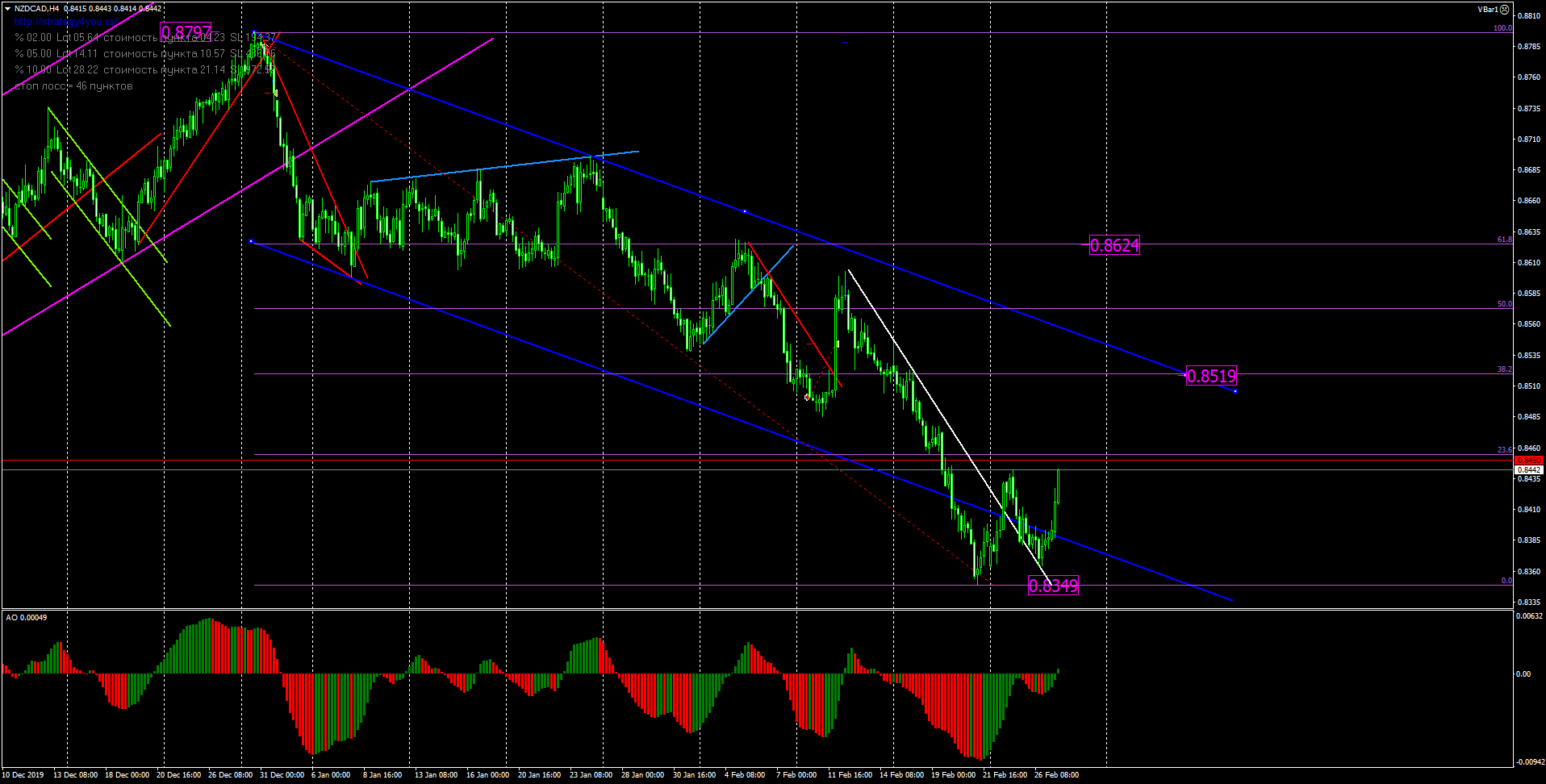 По валютной паре новозеландский доллар канадский доллар на прошлой торговой неделе сформировался минимум 0.8349, а на этой неделе пара начала корректироваться. Цена входит в пределы нисходящего канала, пробив линию сопротивления нисходящую. После чего цена пробивает поддержку канала, тестирует сверху пробитую линию поддержки нисходящую и закрепляется в пределах данного канала. Если пара пробивает максимум данной недели, ждем продолжение коррекционного движения к уровню 38% фибоначчи и к линии сопротивления нисходящего канала.