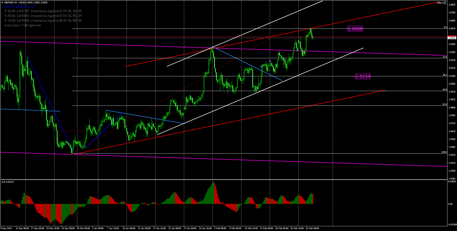 На этой неделе валютная пара британский фунт новозеландский доллар тестирует сверху линию поддержки нисходящую и начинает восстанавливаться. Цена отскакивает от линии сопротивления восходящего канала, сформировав максимум 2.0608. Пробой данного уровня и линии сопротивления восходящего канала это сигнал к продолжению восходящего тренда. А пока можно ждать коррекцию. Коррекция возможна к линии поддержки нисходящей + восходящего канала.