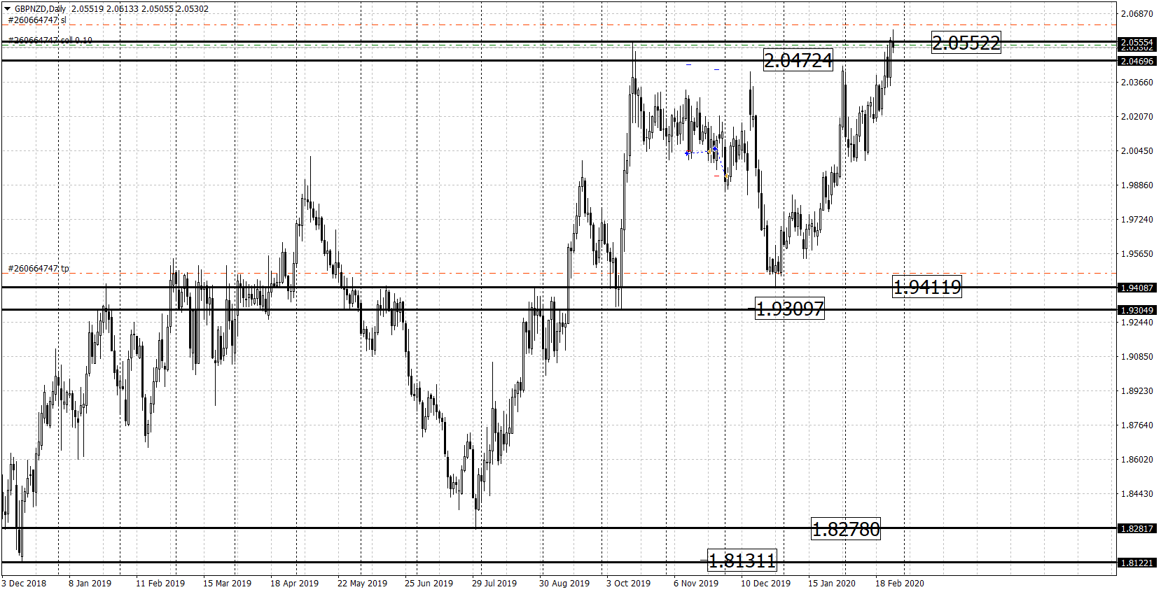 Цена по данному торговому инструменту вошла в пределы области сопротивления на отметках 2.0389 и 2.0554. Для опеределения приоритетов в торговле, ждем выход цены за пределы данной зоны.
