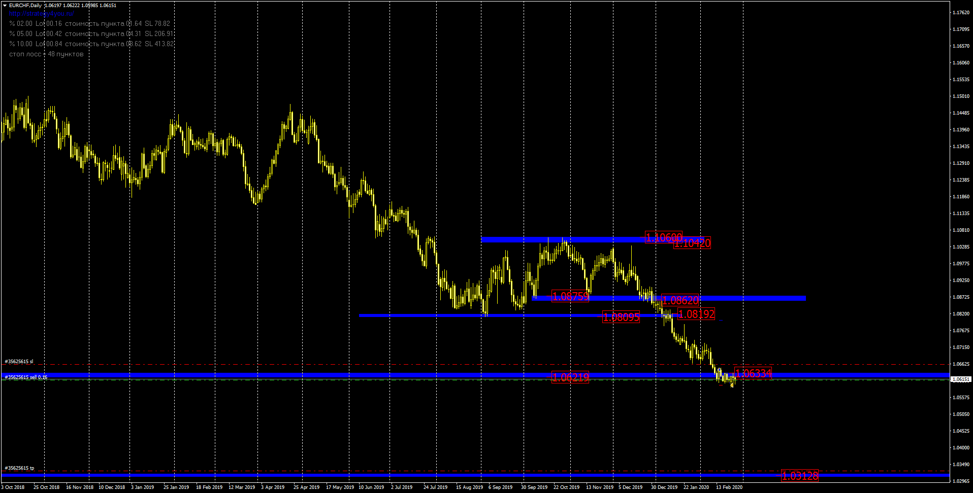 В этом торговом месяце мы инструмент покупали от области дневной поддержки на отметках 1.0633 и 1.0621, после сформированного разворотного паттерна "Бычье поглощение". На графике видно, что цена пробивает данную область поддержки и тестирует ее снизу. Это сигнал к продажам. Инструмент продаем с стопом ниже области сопротивления. Цель по продажам значимая это сильный уровень недельной поддержки на отметке 1.0312.