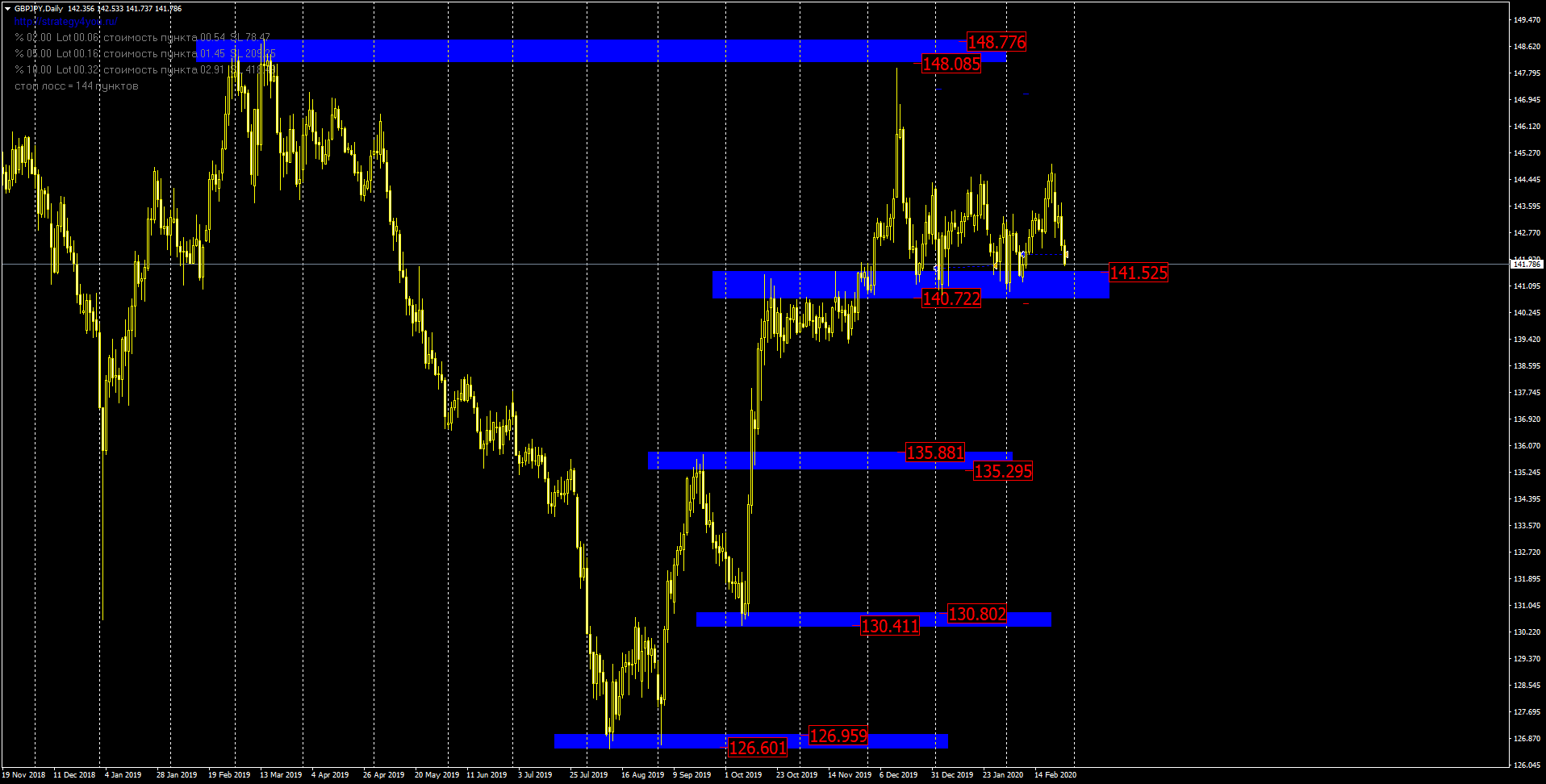 Достаточно давно цена по данному торговому инструменту отбивается от области дневной поддержки на отметках 141.54 и 140.72. В этом месяце цена уже два раза реагировала отбоями на данную область. На графике видно, что в прошлом месяце мы инструмент покупали и сделка была в прибыли + 293 пункта, но закрывается по безубытку. В этом месяце после отбоя цены от данной области инструмент снова покупаем прибыльность по сделке составляла 285 пунктов. Цель по покупкам область сопротивления на отметках 148.08 и 148.77. Сегодня цена обвалилась и сделка закрывается по безубытку. Ждем снова реакцию цены на данную область поддержки.