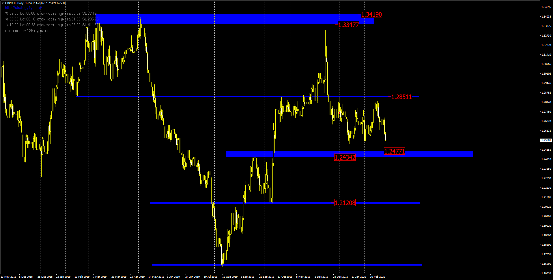 От дневного уровня сопротивления на отметке 1.2851 мы данный торговый инструмент продавали и позиция закрылась по безубытку. В этом месяце мы ждали возврат цены к данному уровню для повторных продаж. Рынок к уровню не дотягивает и на этой неделе нисходящее движение продолжилось. При условии его продолжения, можно искать точки входа на покупку от области дневной поддержки на отметках 1.2477 и 1.2434. Входим в рынок после формирования отбойной бычьей свечи или разворотного свечного паттерна с стопом ниже области с целью к 1.2851.