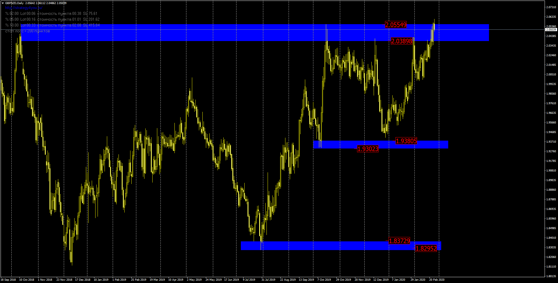 От области дневной поддержки на отметках 1.9380 и 1.9302 мы ждали формирование сигнала в покупку. Но цена не смогла отреагировать на данную область и начала восстанавливаться. В начале данного торгового месяца цена отреагировала на сигнальную область сопротивления на отметках 2.0389 и 2.0554 формированием разворотного паттерна "Поглощение". Сигнал на разворот дает коррекцию, но полноценно не отрабатывается. На сегодняшний день цена закрепляется в пределах области сопротивления. Если этот день закрывается формированием медвежьей свечи от верхней границы области сопротивления, пару можно продавать с стопом выше сегодняшнего дня с целью к 1.9380 и 1.9302.