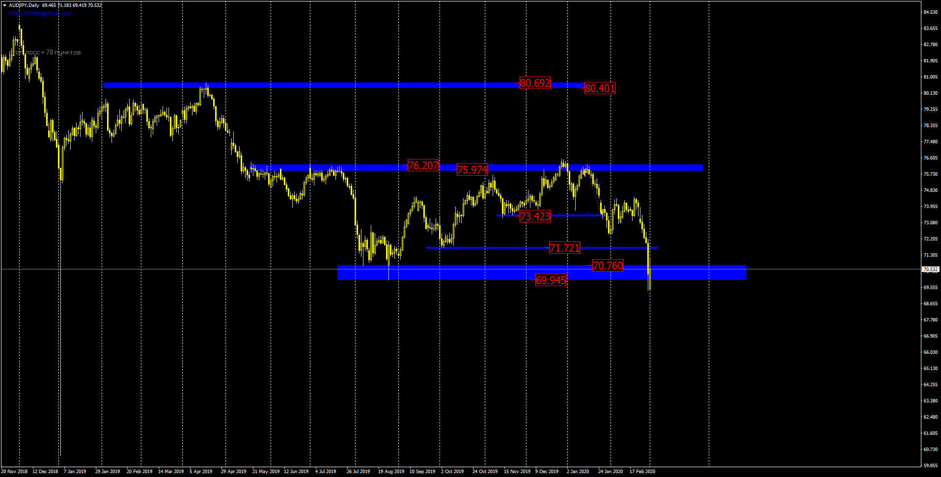 В январе цена по данному торговому инструменту продолжила снижение и сделка на продажу от области сопротивления на отметках 75.97 и 76.20 по сформированному свечному сетапу разворота "Поглощение" закрывается по профиту. Цена пробивает уровень 73.42, а потому мы ждали снижение к уровню 71.72. Цена пробивает данный уровень и неделя закрывается в пределах области поддержки 70.76 и 69.94. От данной области можно рассматривать покупки после формирования отбойных бычьих свечей на Д1 или после разворотных свечных комбинаций с закреплением выше области.