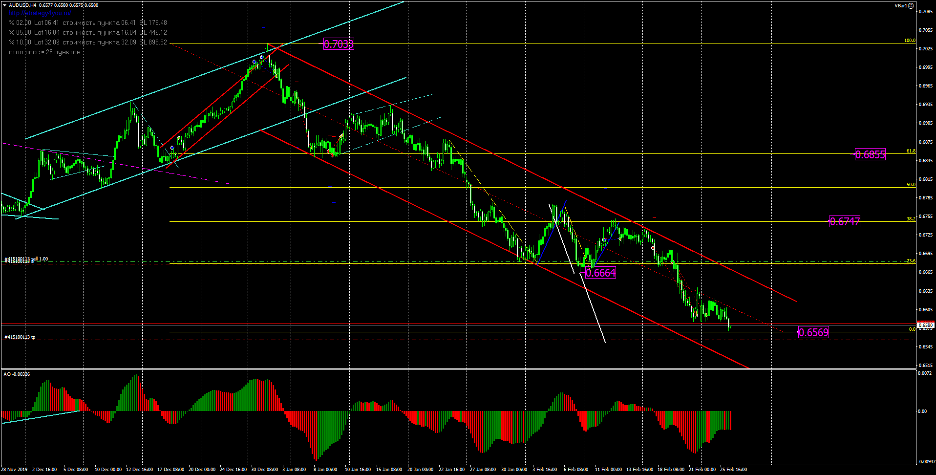 Пробой уровня 0.6630 дает нам точку входа в продажи. Открываем с текущих цен и тейк профит выставляем у уровня 0.6500.