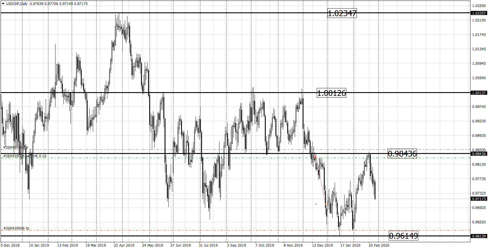 После отбоя котировок от недельного сопротивления 0.9843 мы ждали повторный подход цены к уровню и выставили лимитник на продажу. Рынок не зацепил отложку и обваливается.