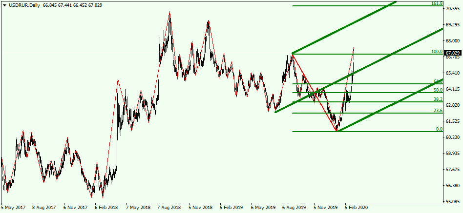 Цена пары USDRUR на графике "день"движется вверх по статичным вилам Эндрюса, которые направлены на север и построены по наивысшим точкам. Цена пары торгуется выше уровня срединной линии вил Эндрюса. Это говорит о том, что цена продолжит свой рост, так как торгуется выше уровня 65.8250. В настоящий момент времени цена пары валют торгуется на уровне 66.1600 и, при открытии длинных позиций по валютной паре, целями роста являются отметки на уровнях 67.9120 и 68.4880. От данных уровней стоит ожидать разворота вниз и открывать можно будет продажи с целями на уровнях 64.8400 и 64.0000.