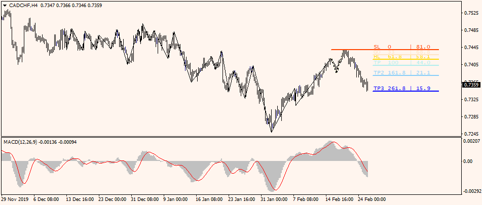 Валютная пара CADCHF на графике Н4 торгуется в нисходящем канале и цена находится во флете. Если же рост продолжится далее, то цена сможет пробить отметку в зоне уровня 0.7400. Далее подъем цены продолжится к уровням 0.7455 и 0.7600. Если цена пробьет уровень 0.7325 вниз и закрепится под ним, тогда падение продолжится к уровню 0.7265. Индикатор показывает на возможность открытия длинной позиции по валютной паре с текущей цены.