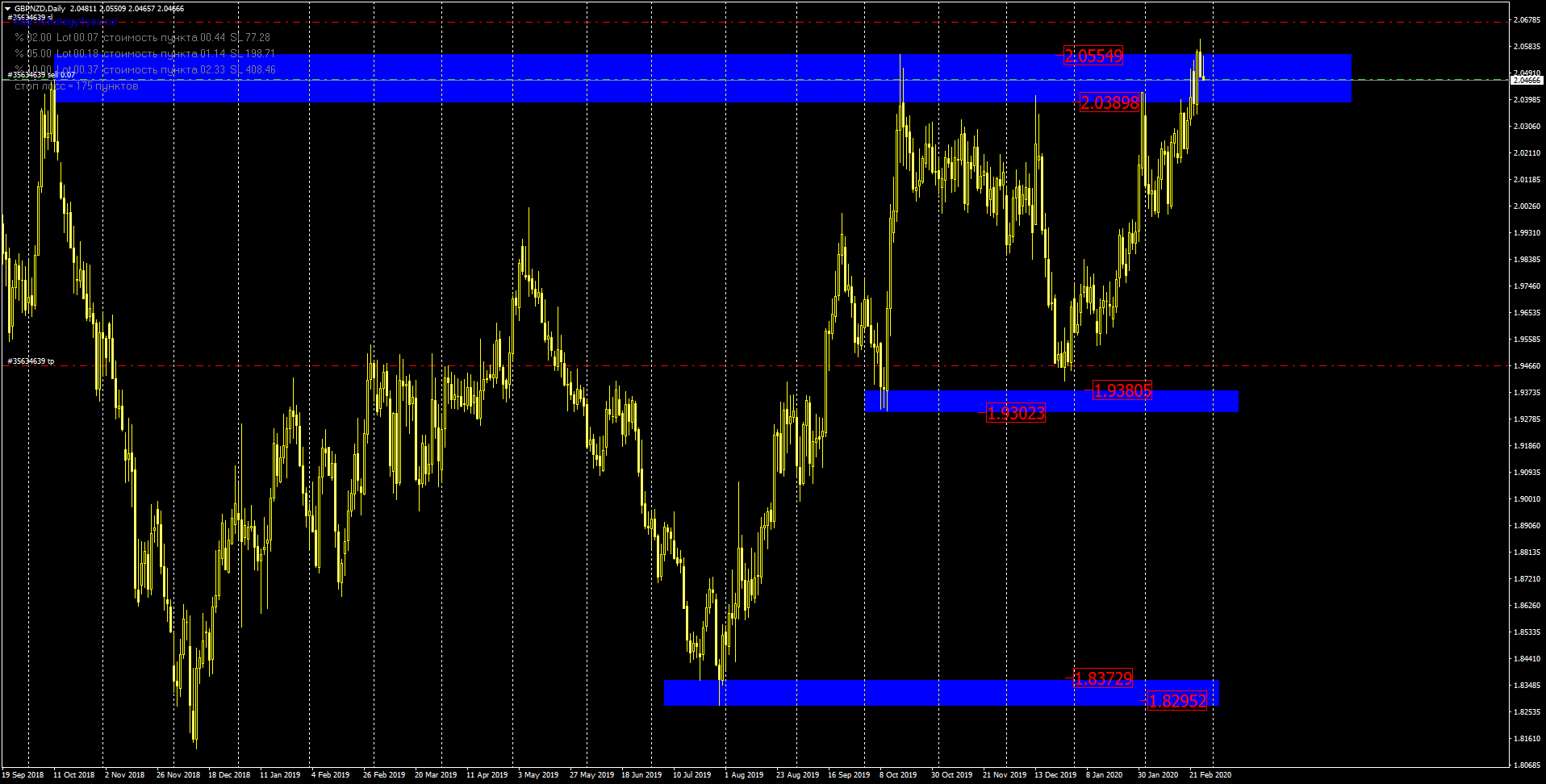 От области дневного сопротивления 2.0389 и 2.0554 формируется отбойная свеча. Инструмент продаем в долгосрок.