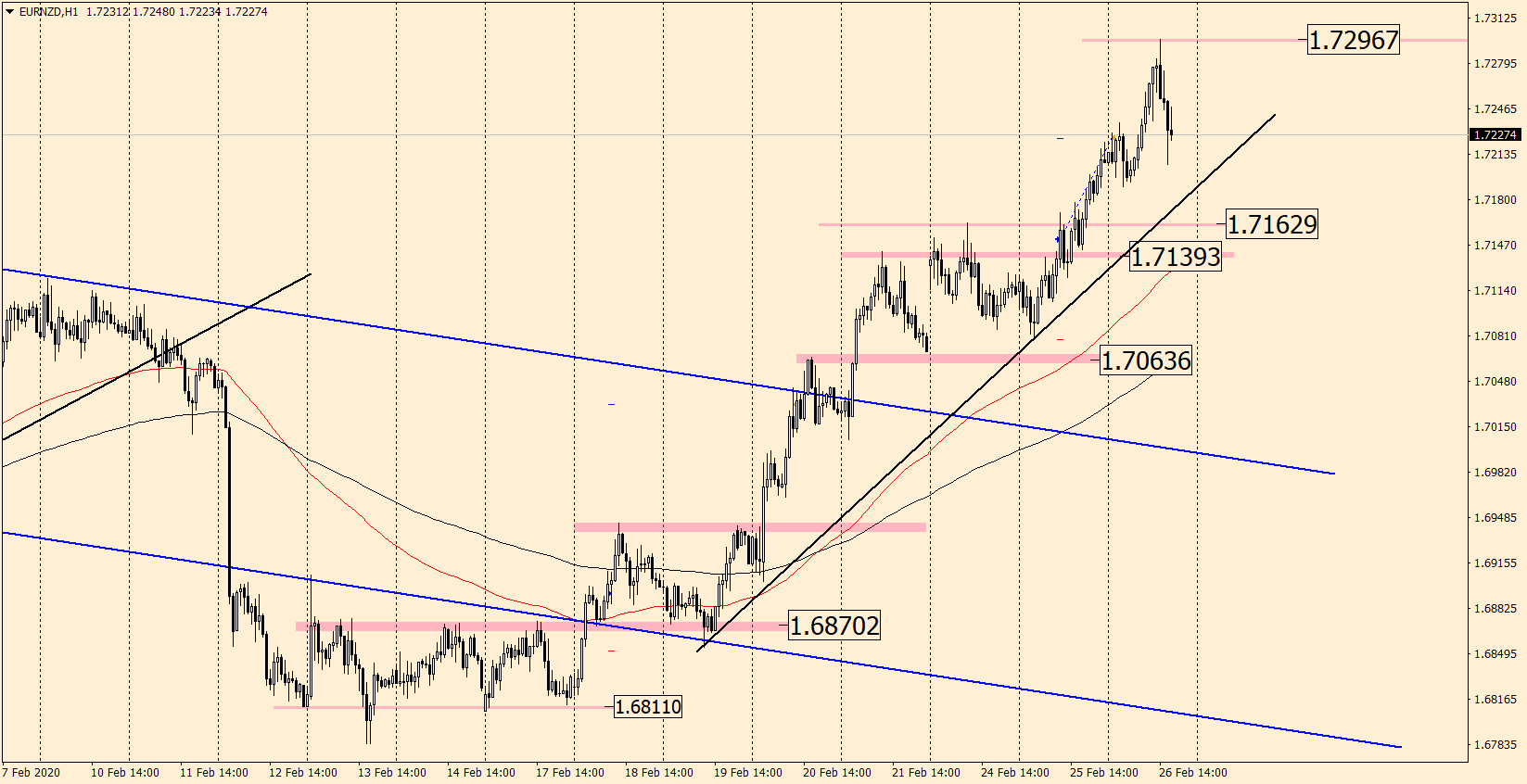 На прошлой неделе котировки уверенно закрепляются выше ЕМА 100 и 200, а также находятся выше трендовой наклонной линии, что говорит о приоритетах к лонгам. Вчера мы рекомендовали актив покупать на пробое уровня горизонта 1.7139. После закрепления котировок выше 1.7162 мы поняли, что рост продолжится. Данная позиция закрывается с прибылью. Пока цена корректируется. После завершения коррекции актив покупаем на пробое горизонта 1.7296.