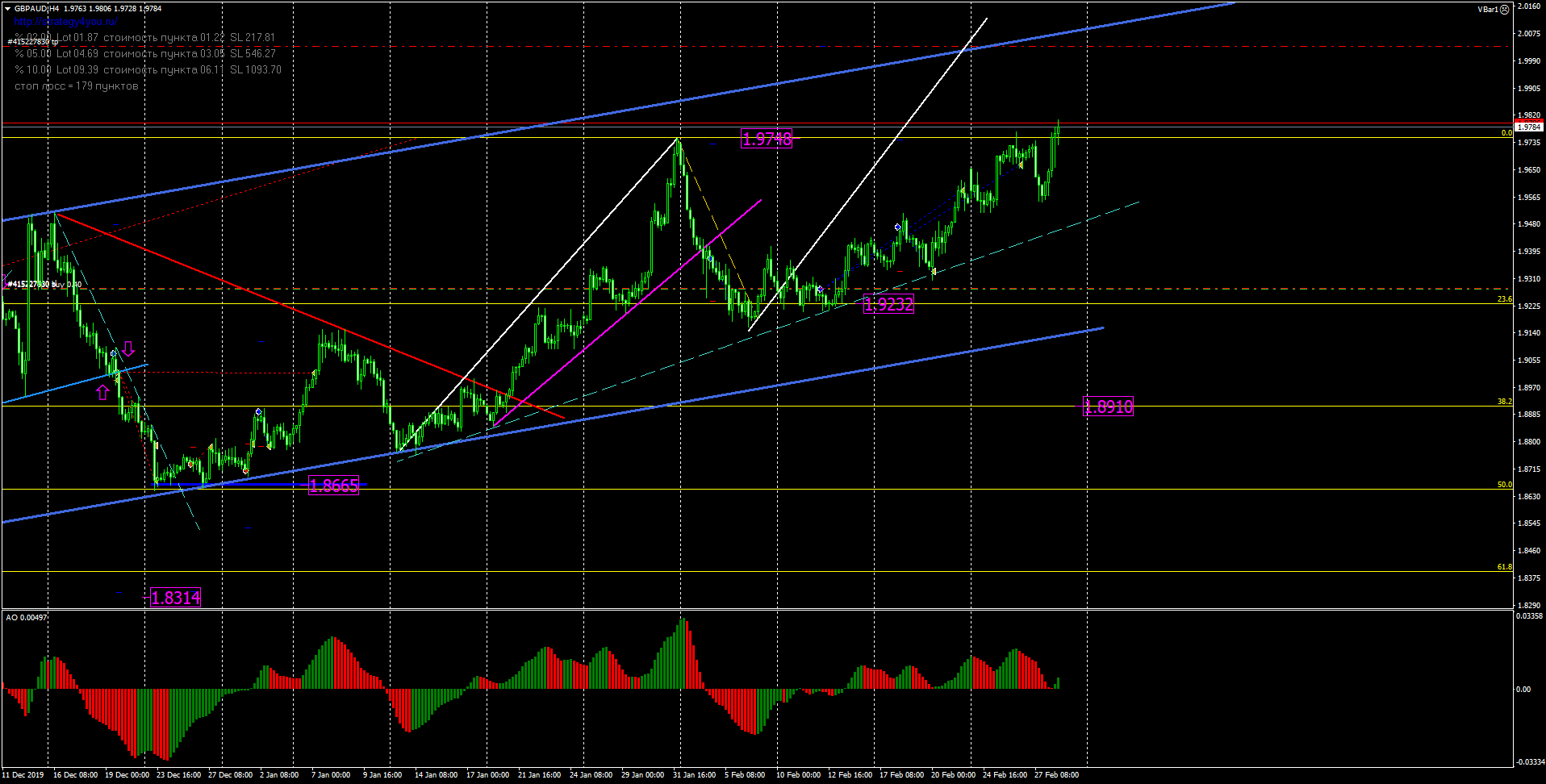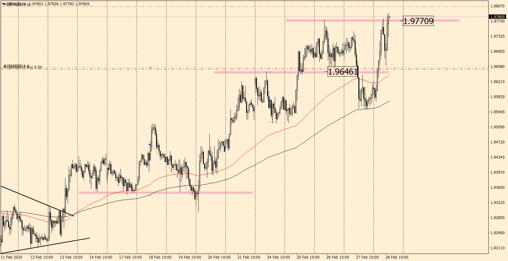 Котировки по данному активу на прошлой неделе уверенно закрепляются выше ЕМА 100 и 200, тестируют данные скользящие средние несколько раз сверху и бычья динамика продолжилась. 25 февраля мы актив покупаем после пробития ценой уровня горизонта 1.9646, после тестирования горизонта сверху. Сегодня цена пробивает максимум 26 февраля 1.9770 и мы переводим позицию на покупку в безубыток и ждем отработку наших целей. К профиту остается несколько пунктов. Ждем цель.