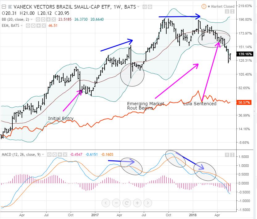 VanEck Vectors Brazil Small-Cap ETF (BRF): Brazil Small Caps Index. One of the Real Vision short ideas I read over the weekend was to go short Brazil on the back of the political uncertainty ahead of the October elections for which there are currently 19 candidates. More compelling was the discussion about the weakness of the Brazilian currency. Step 1 for going short is to reassess the long positions one is holding. I am invested in Brazil through this small caps ETF and through Petrobras, the oil producer.