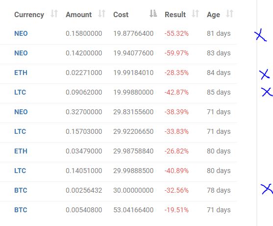 Outsourced Bot One closed trade on this account on STRAT (2.68% - 2 days) which was replaced with a trade on XLM (205 closed trades). Problem children was added to with BTS joining (>10% down) - (15 coins) - ETH, ZEC, DASH (-41%), BTS, ICX, ADA, PPT, DGD, GAS (-47%), STRAT, NEO (-47%), ETC (-43%), QTUM, BTG (-45%), XMR.