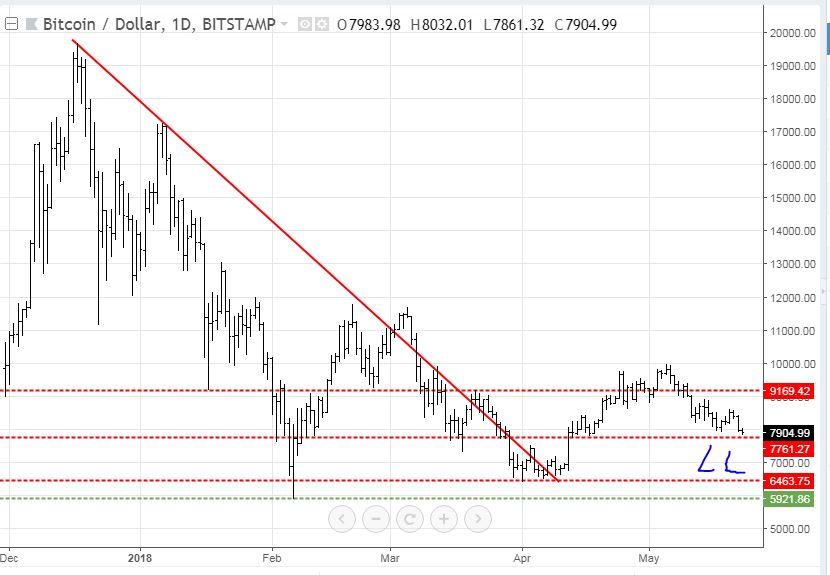 Bitcoin (BTCUSD): Price range for the day was $466 (5.5% of the high). Price is clearly uncomfortable in "no mans land" and wants to test the bottom again. Price has already made a lower low today.