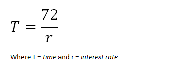 The Rule of 72 gives a simple approximation of the time an investment will double in numbers at a given interest rate. It can be presented simply using this formula.