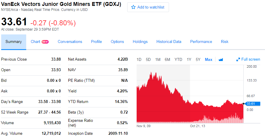 - Leveraged plays on gold miners, for example https://finance.yahoo.com/quote/JNUG/ , not suitable for long-term holding, only for day-trading