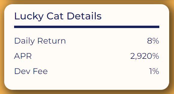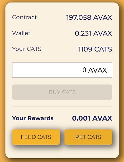When you buy cats, your AVAX gets locked into the Lucky Cat smart contract and rewards you with 8% daily return every day.