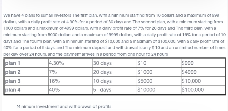 The minimum starting of $10,000 and a maximum of $100,000, with a daily profit rate of 40% for a period of 5 days.